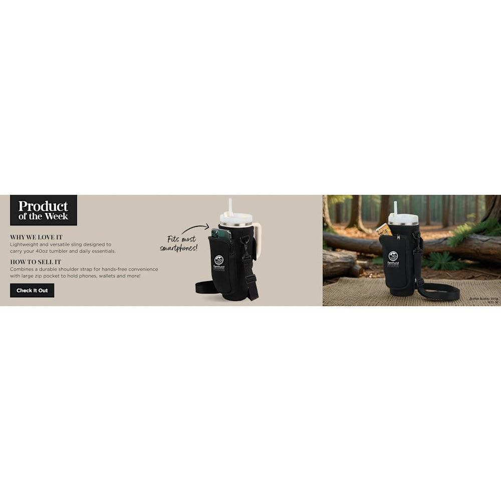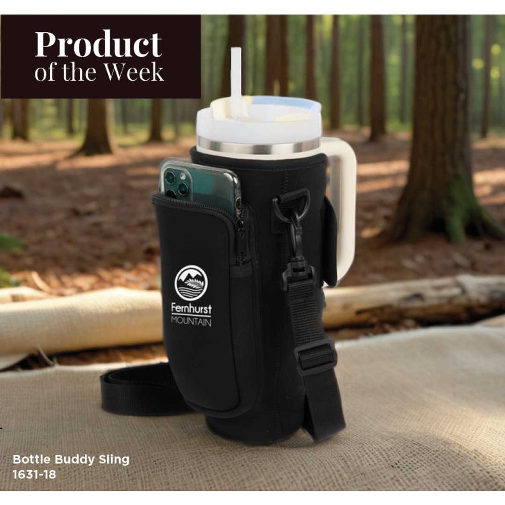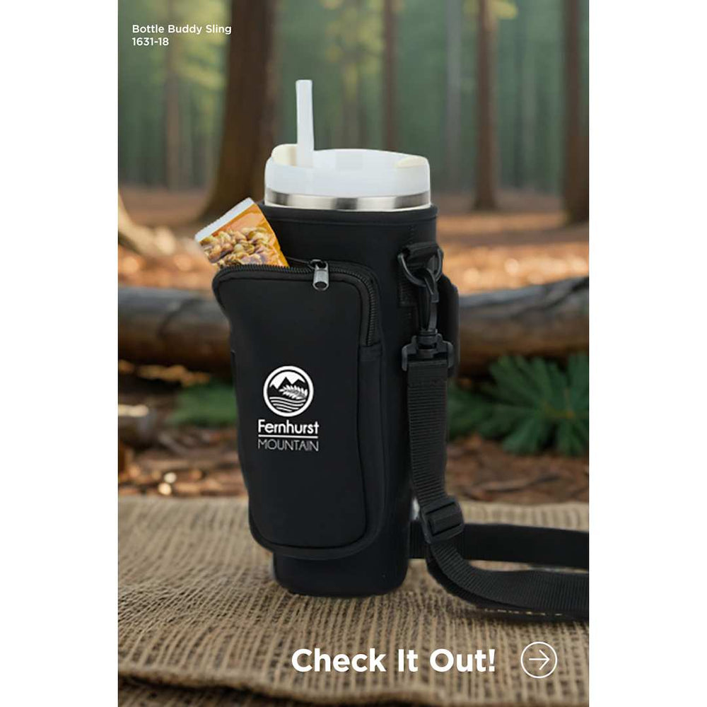 Staying hydrated has never been easier with the Bottle Buddy Sling! Easily carry your tumbler everywhere you go by securely strapping in your bottle. Features an opening large enough to hold 40oz travel tumblers with handles, secure the tumbler in place with the heavy-duty hook-and-loop strap. Includes a front zippered pockets, perfect for storing your phone, wallet or even keys! The carry strap is adjustable from 27-51-inches and can be easily unclipped and removed.
