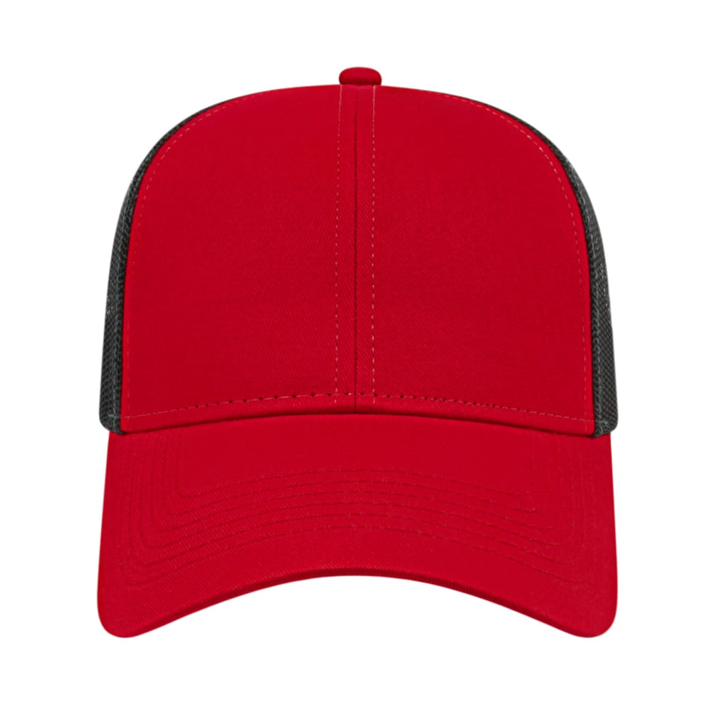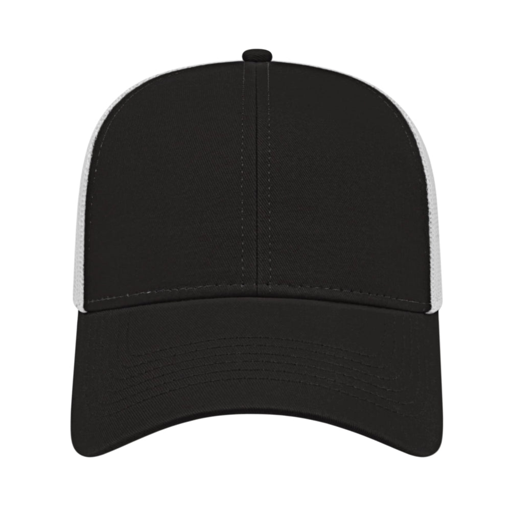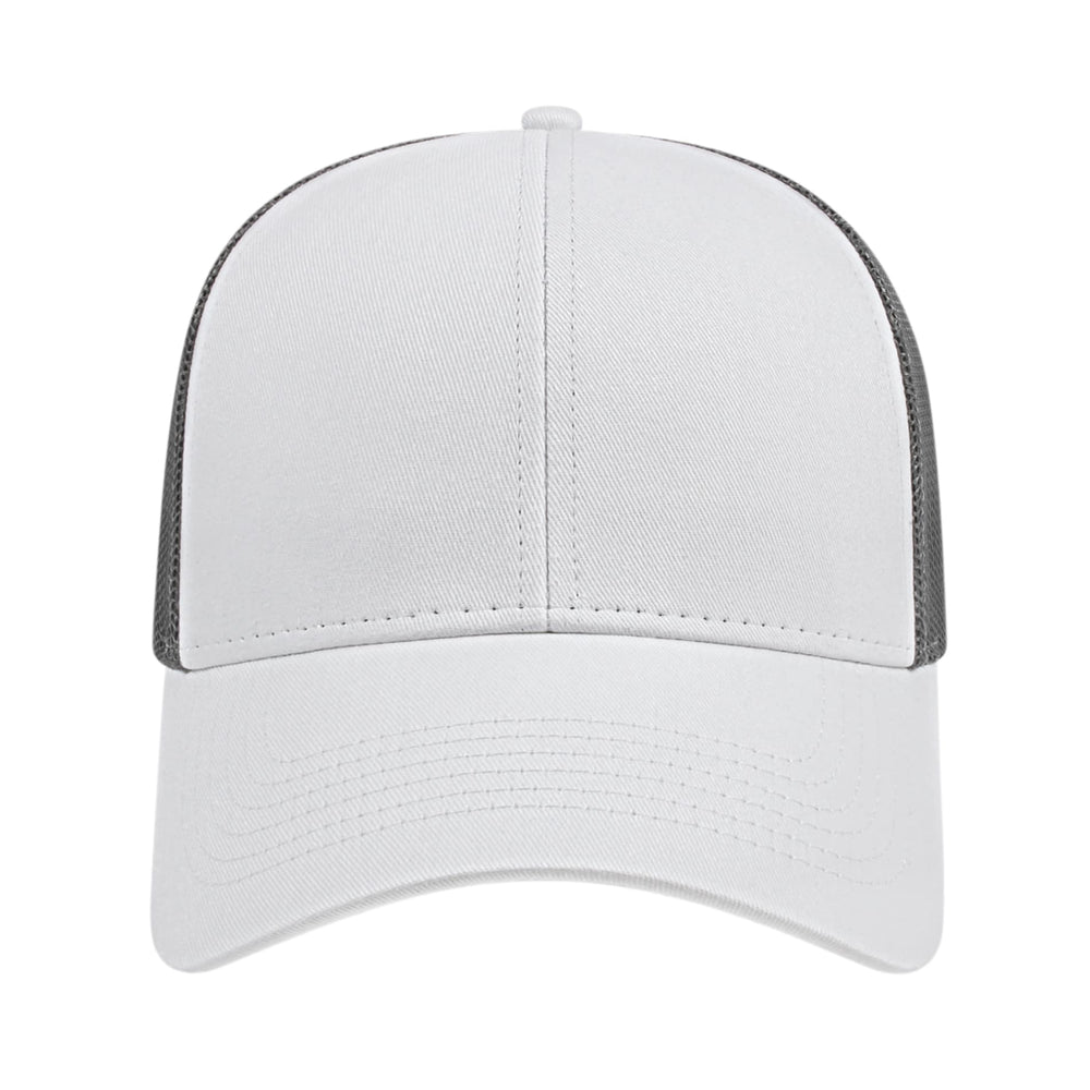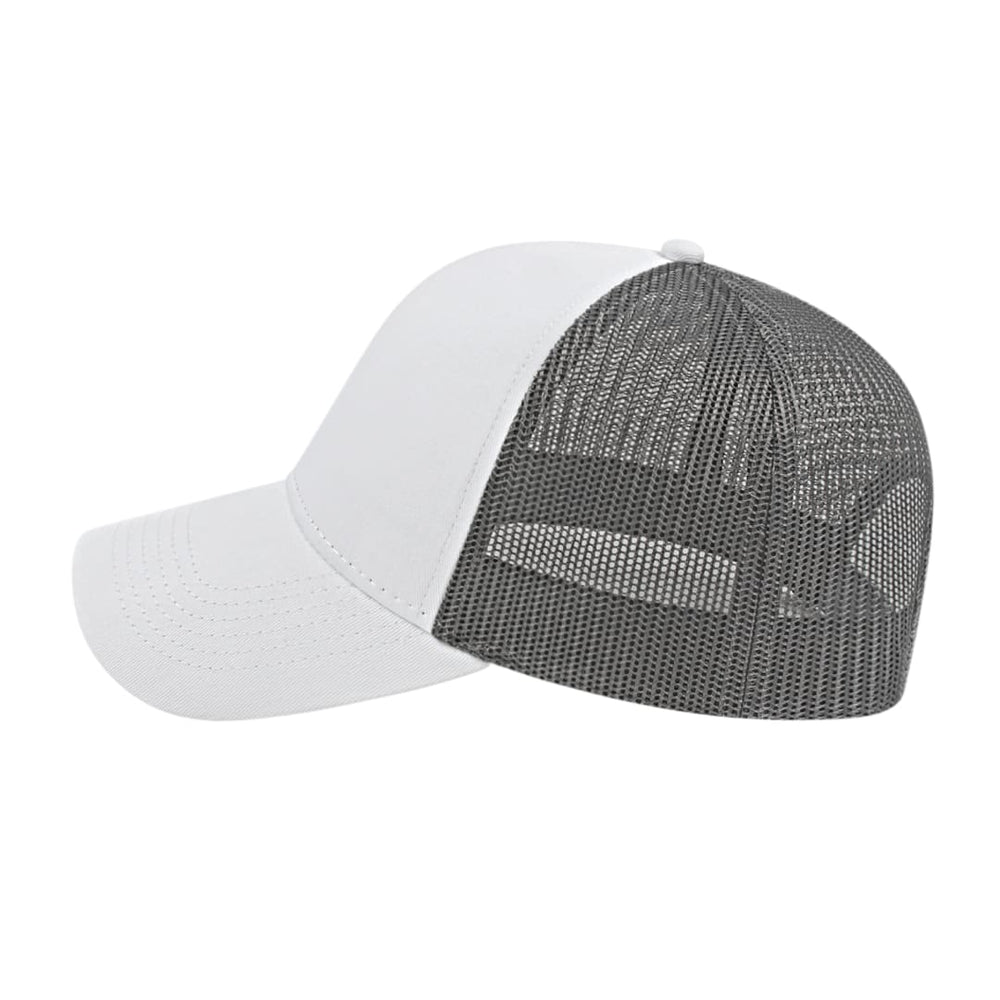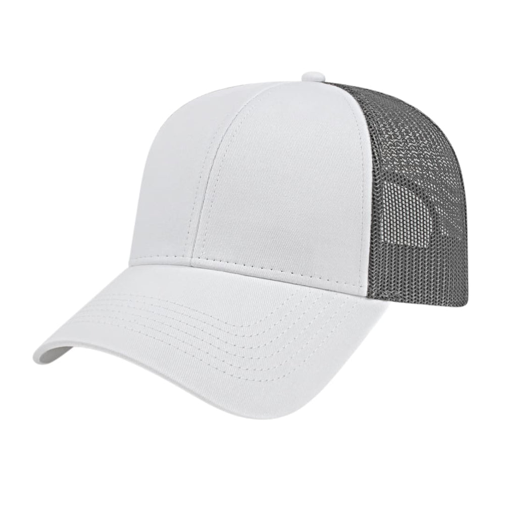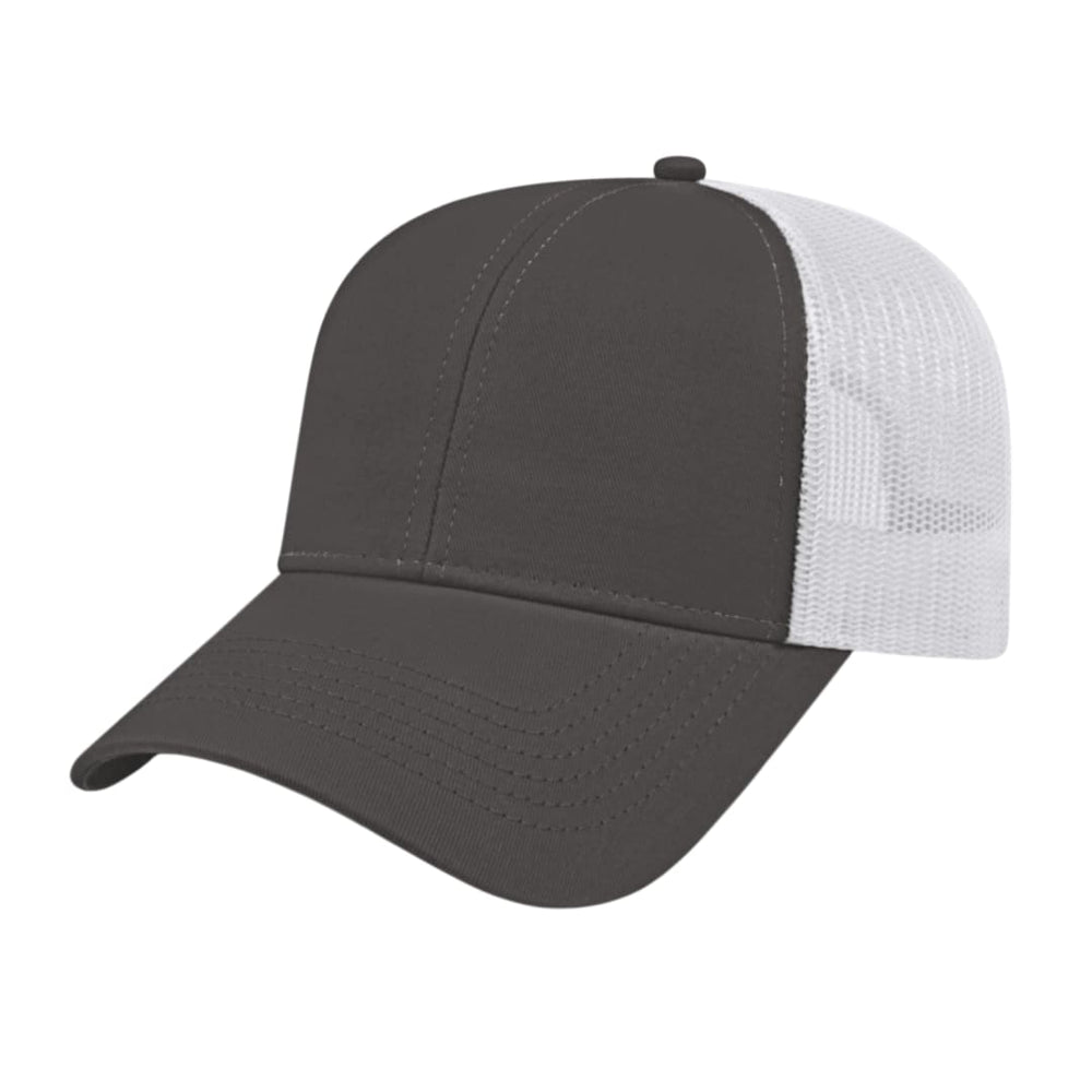 The Cap America Two Tone Trucker Mesh Back Cap is a medium profile, six panel structured cap made using a flat cotton twill with a trucker mesh back. This trucker hat features a standard pre-curved visor and an adjustable plastic snap tab closure.