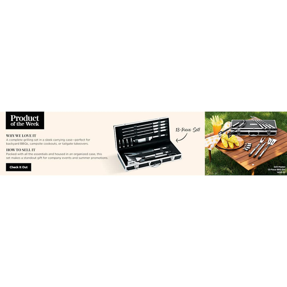 This 13-piece BBQ set includes everything needed to be king or queen of the backyard grill - spatula, tongs, knife, fork, four skewers, and four corn holders, all in an aluminum accented case. Handles are plastic with stainless steel grip to prevent heat transfer. For the skewers this allows you to hold the handles and have full control basting food and perfecting the amount of charring you want. Do not expose the handles to direct heat or use in broiler.