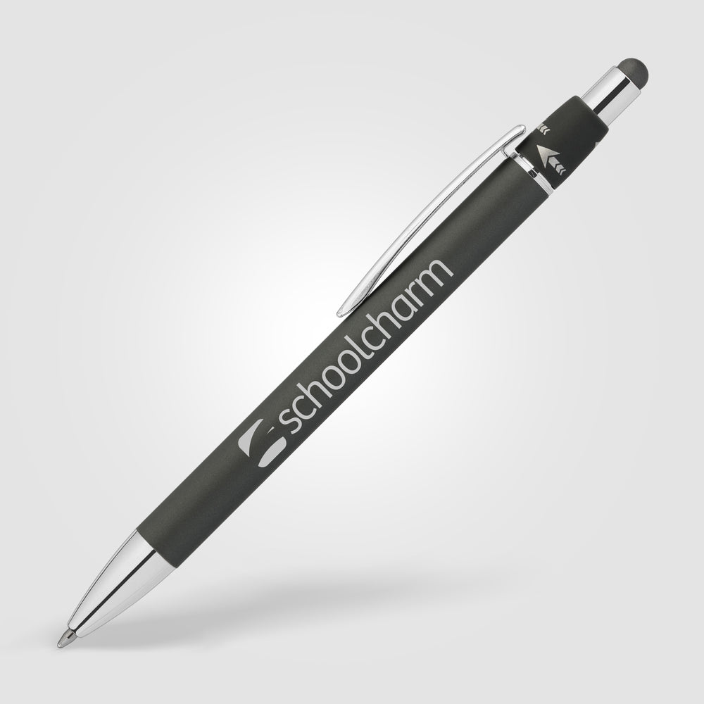 Introducing our new Orbit Spinner Chrome Metal Pen with Stylus—a perfect blend of functionality and style. It features a retractable aluminum barrel with a sleek rubberized finish for a comfortable writing experience, complemented by elegant chrome trim ideal for corporate settings. The top boasts a unique rotating fixture with silver arrows for a satisfying fidgeting experience, while a matching stylus on the plunger allows seamless transitions between paper and digital interfaces. Complete with a slim refill with Dokumental Ink and a 1.0mm tip, this pen ensures smooth, professional writing.