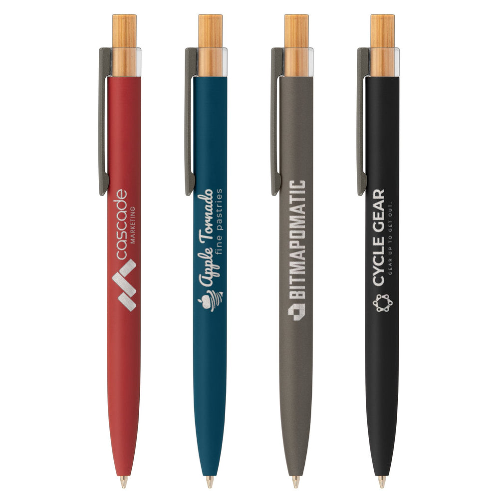 Our new Reborn Recycled Aluminum Pen is a stylish and sustainable metal pen.  Its sleek, modern design includes a barrel made with recycled aluminum, accented by a renewable bamboo plunger, gunmetal stainless steel clip, and clear RPET recycled plastic surround.  This click-action pen features a 0.7 mm fine ballpoint and high-capacity Parker-style ink cartridge with 5,900-foot / 1,800-meter writing distance, for a long-lasting, premium writing experience. This pen features a recycled symbol on the barrel, opposite from the clip, to highlight its innovative recycled aluminum barrel.