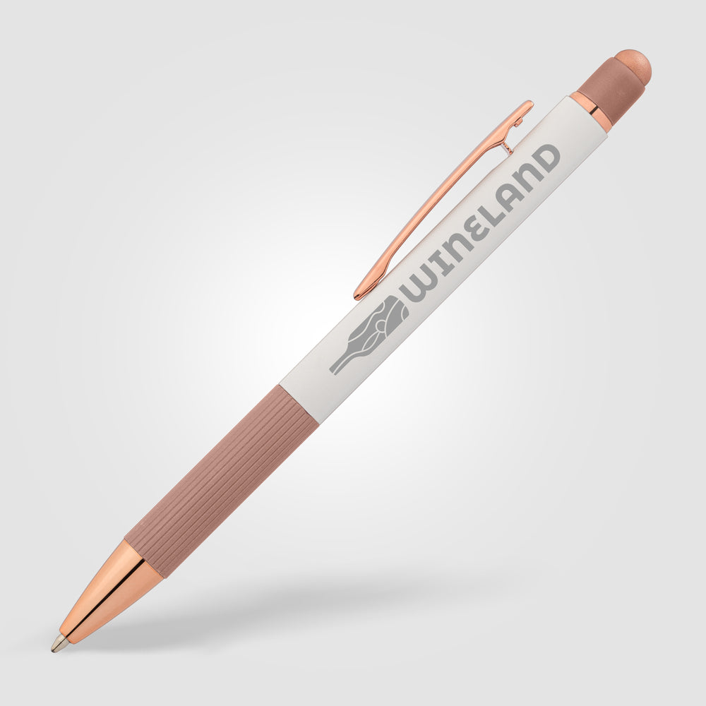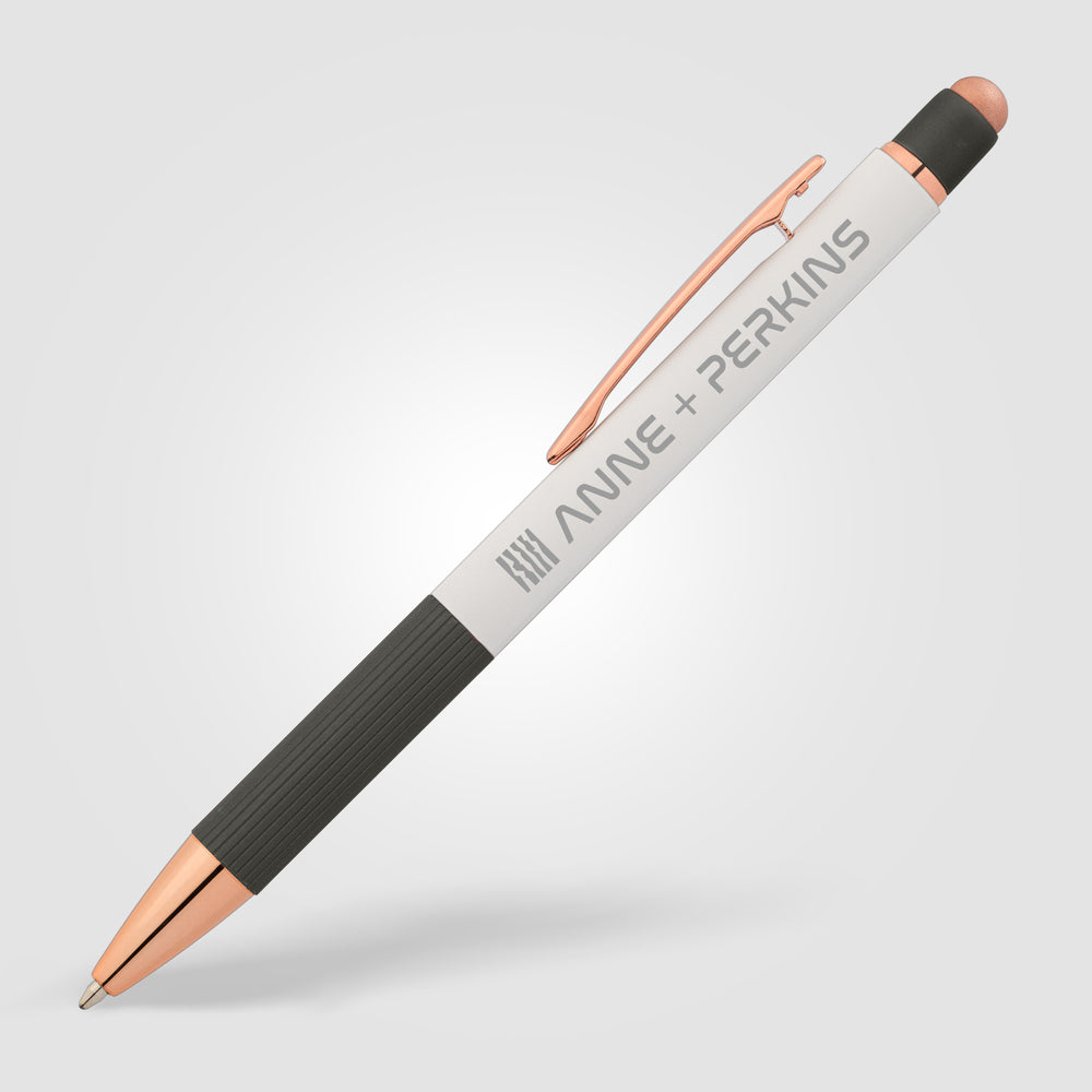 Introducing our Ridgecrest Rose Gold Pen, a chic and lightweight writing companion seamlessly blending style and functionality. The pen showcases an aluminum white barrel with a colored grip area, and a plunger that coordinates seamlessly with a soft rubber grip, embellished with vertical lines for a sophisticated design. Adding to its visual appeal are the rose gold accents on the tip and clip, perfectly matching the stylus color.