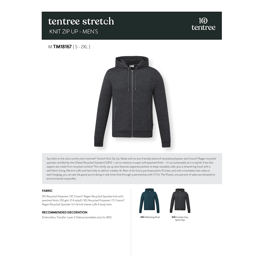 Say hello to the ultra-comfy men’s tentree® Stretch Knit Zip Up. Made with an eco-friendly blend of recycled polyester and Creora® Regen recycled spandex certified by the Global Recycled Standard (GRS) – not to mention a super-soft peached finish – it’s as sustainable as it is stylish. Even the zippers are made from recycled content! This comfy zip up also features zippered pockets to keep valuables safe, plus a drawstring hood with a self-fabric lining. Rib knit cuffs and hem help to deliver a better fit. Best of all: Every purchase plants 10 trees, and with a trackable tree code on each hangtag, you can see the good you’re doing in real time! And through a partnership with 1% For The Planet, one percent of sales are donated to environmental nonprofits.