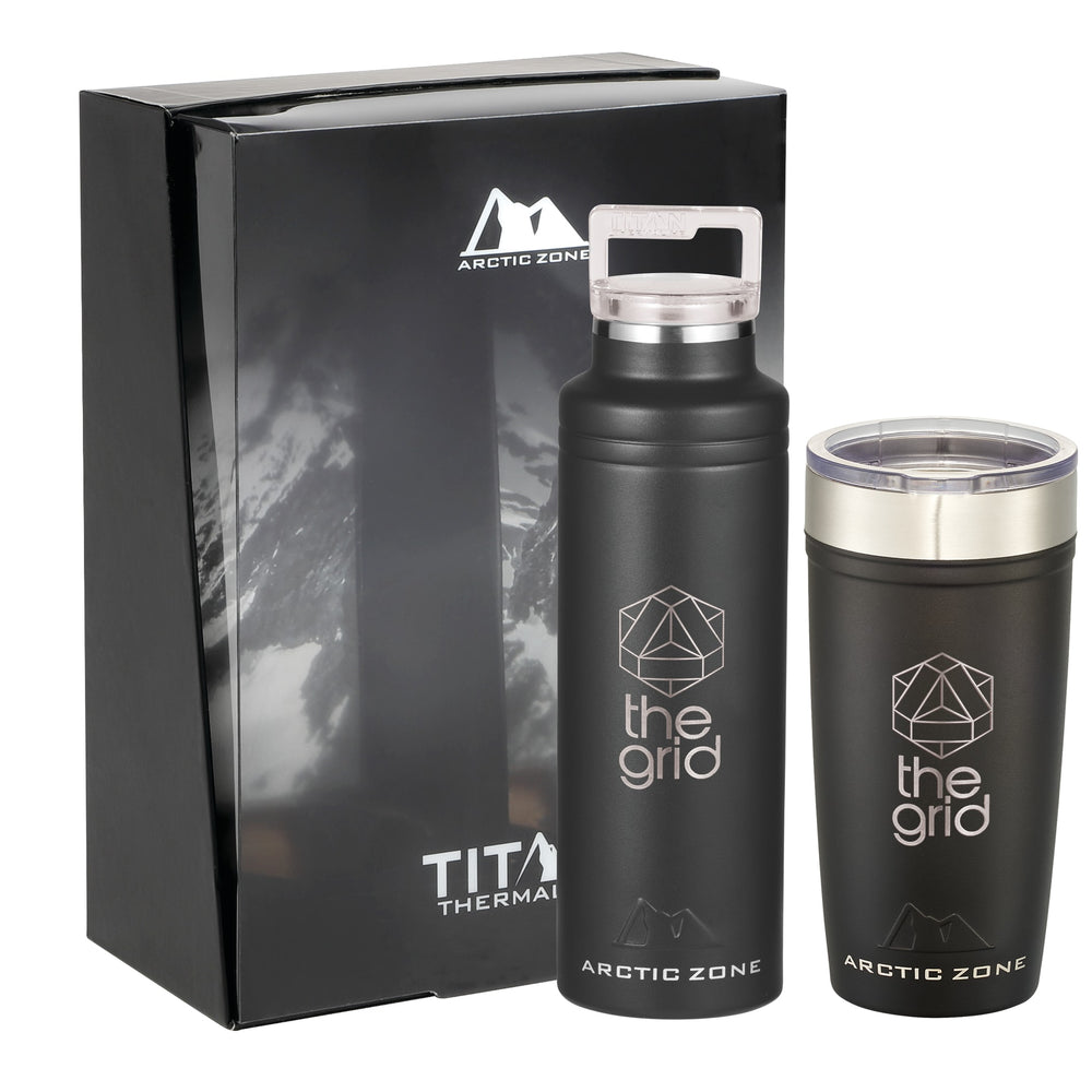 Do not miss out on one of the best gift sets of the year. Includes the Arctic Zone® bottle 1626-22 20oz and the Arctic Zone® 20oz Tumbler 1625-66. Durable, double-wall 18/18 stainless steel vacuum construction with copper insulation, which allows your beverage to stay cold for 24 hours and hot for at least 8 hours. The construction also prevents condensation on the outside of the piece. Leed's Exclusive. 20oz. Gift Box is not decorated. There might be a tiny color variance across the components in a set. “For additional protection, all Drinkware pieces will be individually polybagged and inserted in the gift box.”