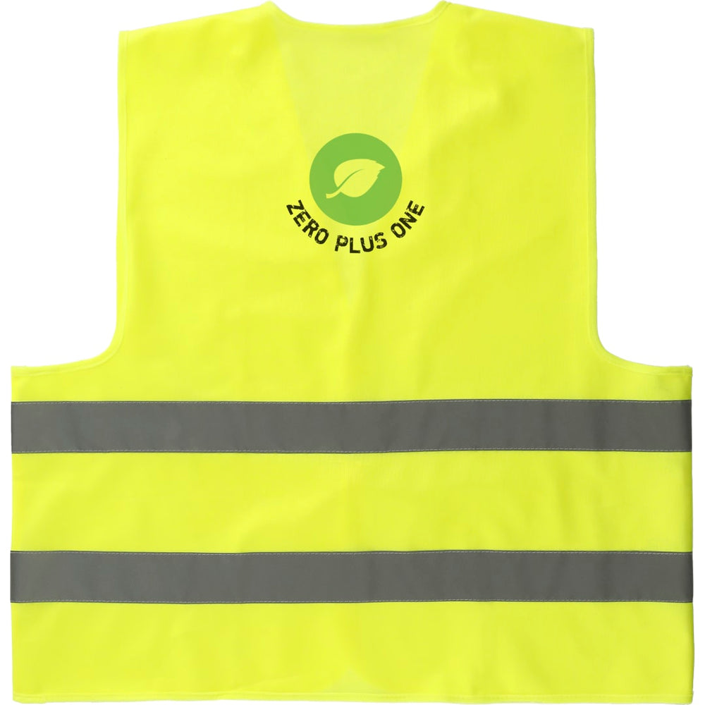 The Safety Vest is a neon yellow safety vest with reflective stripes. One size fits most up to XL. Hook and loop closure on the front.