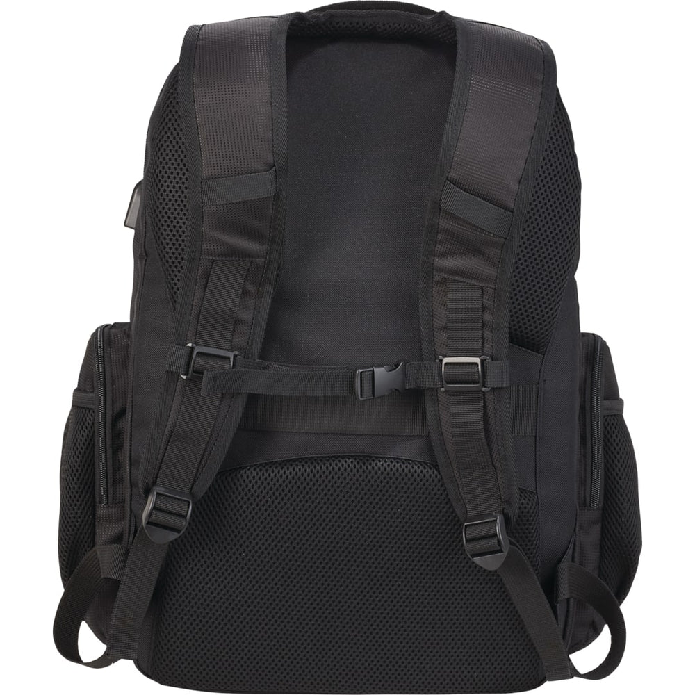 The Rainier TSA 17" Computer Backpack features a large zippered main compartment that offers ample room for all of your tech accessories and tablets. Main compartment has built in USB port and cable which allows for seamless charging capabilities of your tech products inside the backpack. Includes a 17 inch TSA computer compartment that unfolds to lay flat on the X-ray belt to increase speed through security. Additional storage on the front panel of the bag include a deluxe organizational panel, easy access top pocket compartment and two zippered side pockets with mesh water bottle pockets. Custom zipper pullers, padded back panel, chest strap and trolley sleeve.