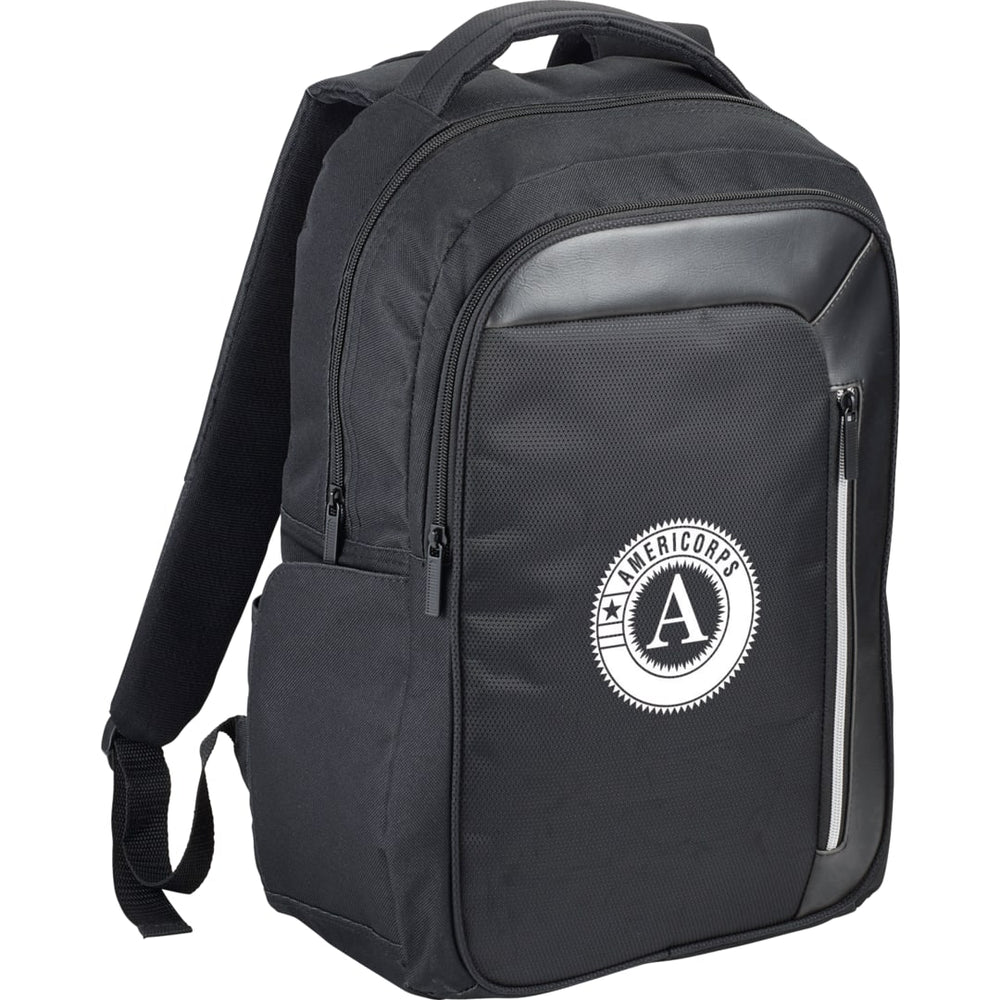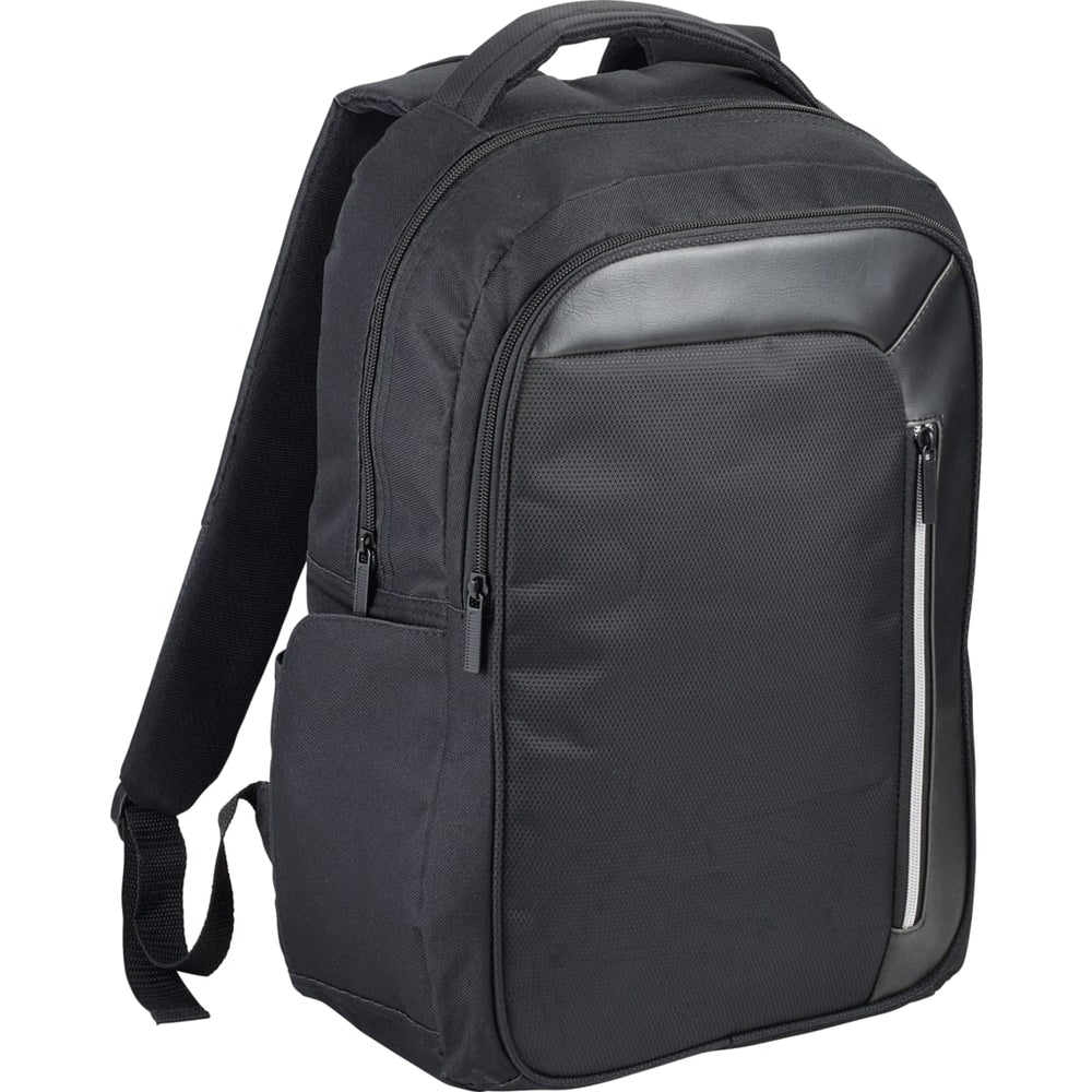The Vault RFID Security 15" Computer Backpack will prohibit unauthorized access to your belongings. Zip through the airport or sit in a meeting – with sleek, contemporary styling and Top-Secret design elements, you're covered with RFID security technology. Standard features include a zippered main compartment that holds up to a 15 inch laptop as well as a separate padded compartment for your iPad® or tablet. Large front zippered pocket has organizational features that include a key fob and hidden zippered RFID blocking pocket to protect against identify theft of your credit cards and passport. Front vertical zipper is designed for quick access to the front pocket. Additional storage with two side pockets. Adjustable, padded backpack straps with webbing details that add functionality so you can clip on whatever else you need. Carry handle and trolley sleeve all for easier travel. Disclaimer: There may be minor variations in color of the actual product.