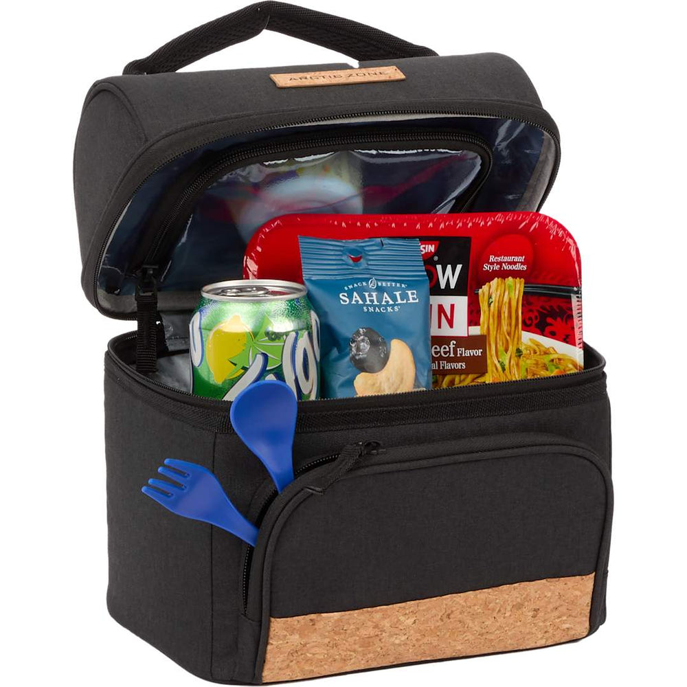 Carry your lunch in style with the Arctic Zone 6 Can Bahama Lunch Cooler. Featuring cork trims and finishes, the Bahama has a unique, attention-grabbing look. The cooler has a zippered main compartment, PEVA-lined interior for easy cleaning, and a secret hidden pocket on the inside. This cooler is made with a rPET main fabric material. .