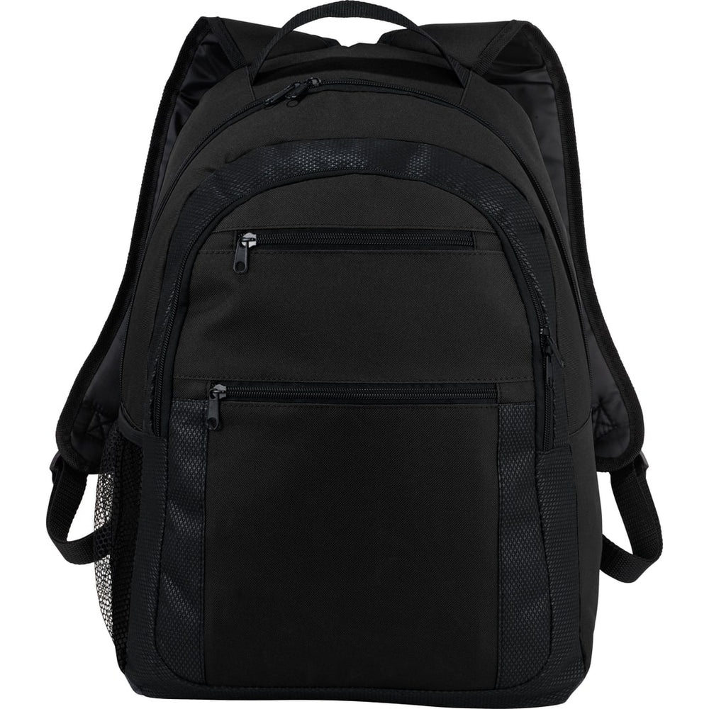 The Executive 15" Computer Backpack has a large zippered main compartment that houses a padded sleeve that can hold up to a 15 inch laptop. A slim second zippered compartment has an organizational panel for additional storage, plus two zippered front pockets and a side mesh pocket. Featuring non-woven accents throughout it also includes a padded, adjustable shoulder straps and a top grab handle.
