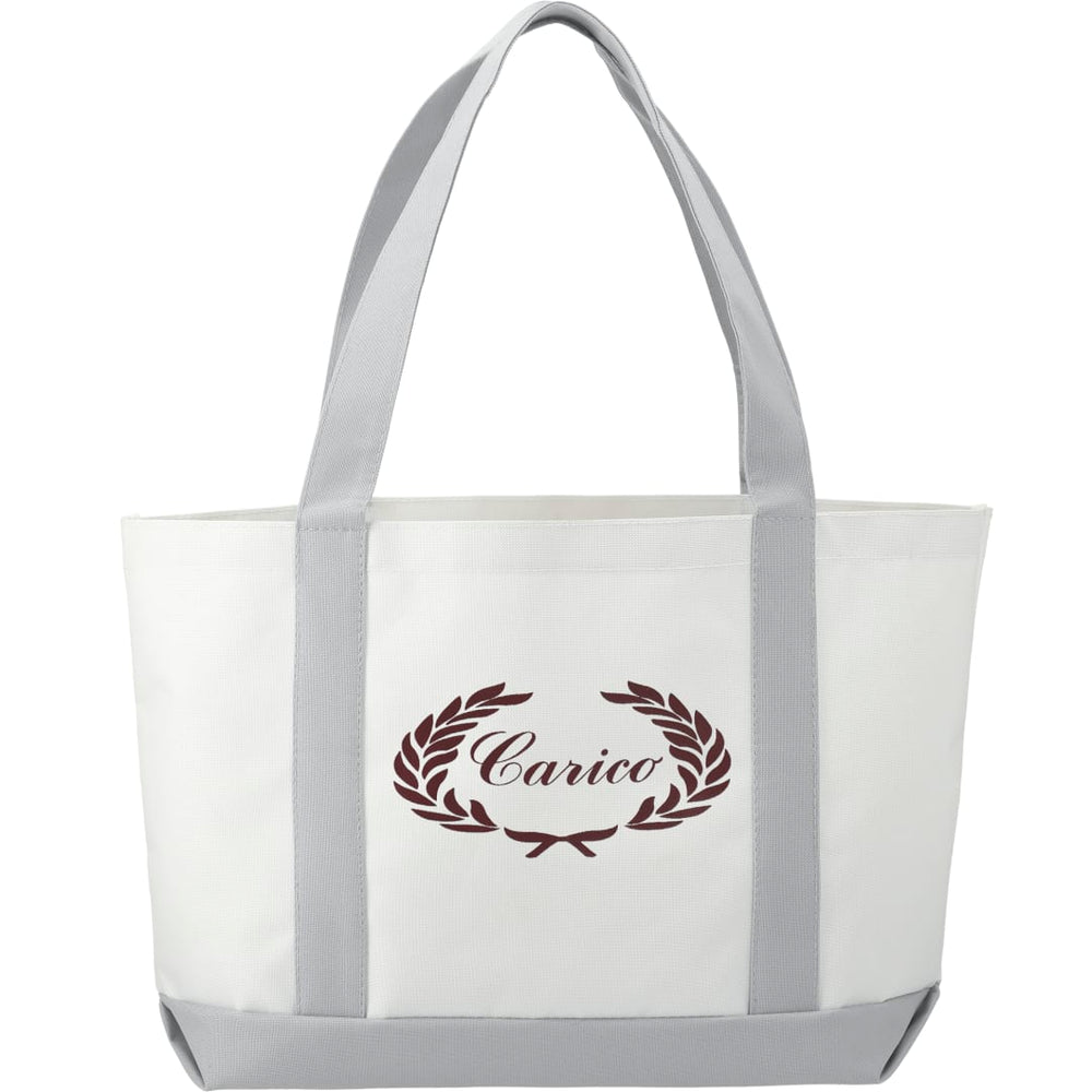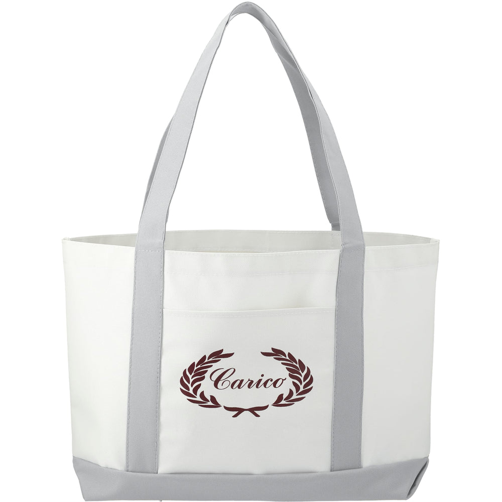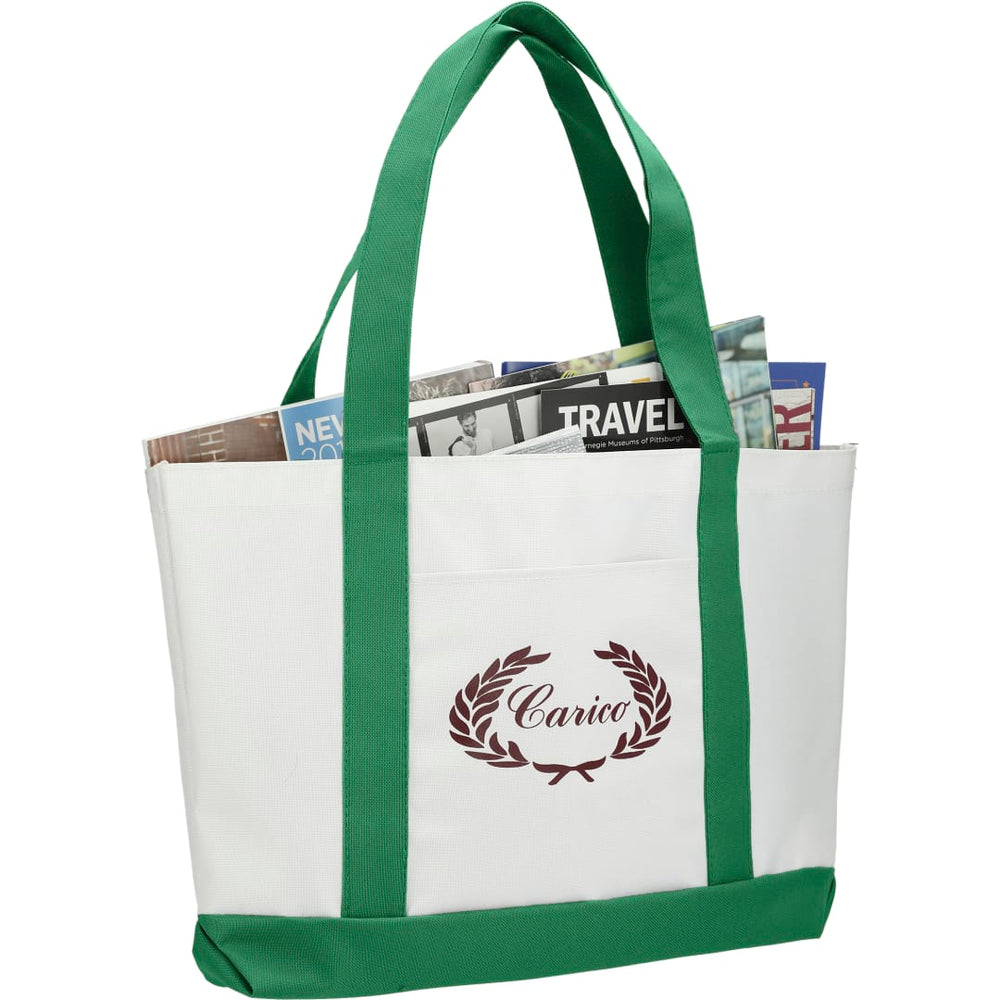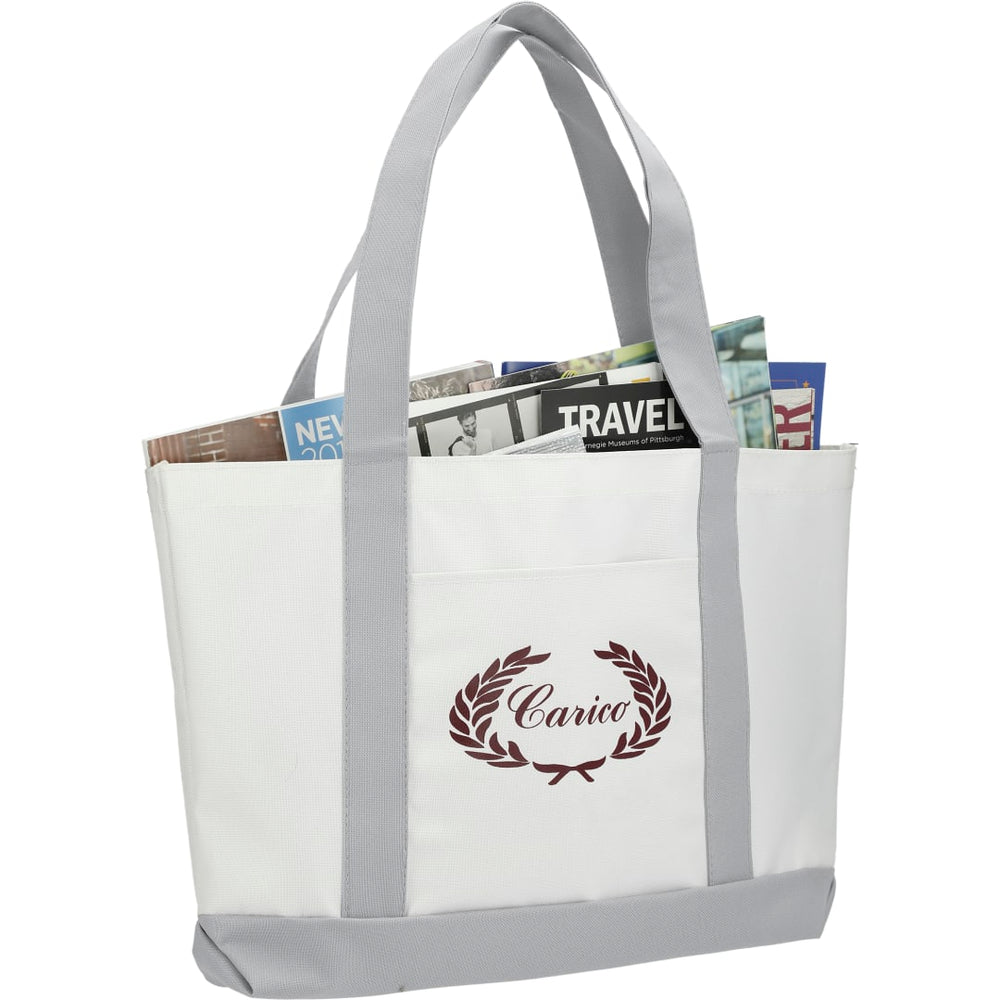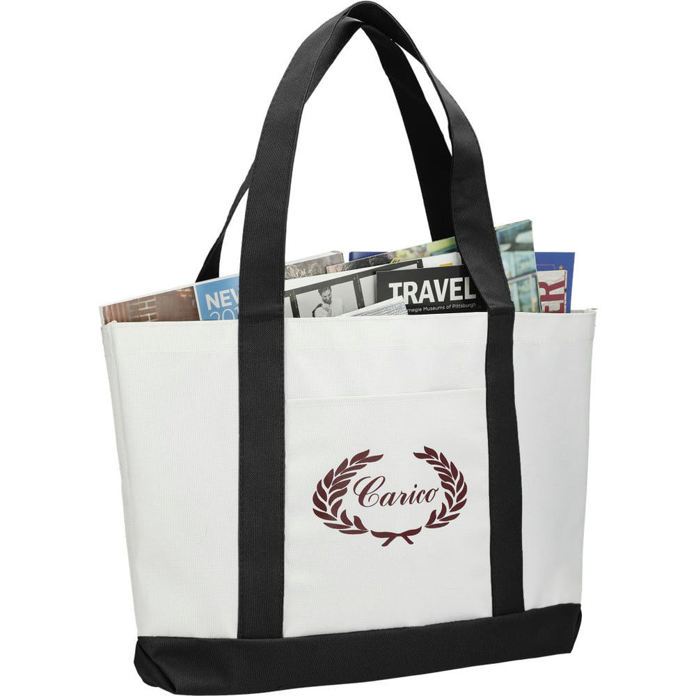 The Large Boat Tote has a large open main compartment with an open front pocket and double 23 inch handles. Disclaimer: Gusset & Handle Decorating is Transfer Only and does not qualify for one day return.