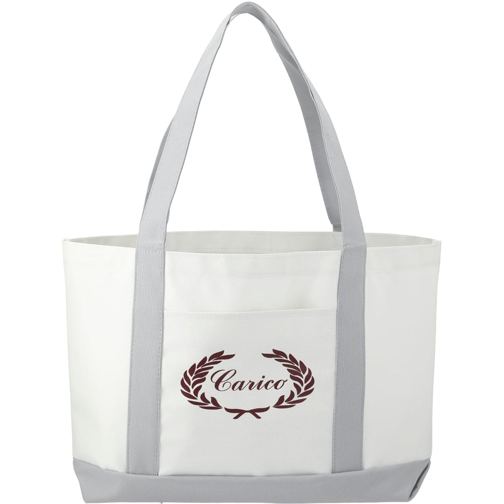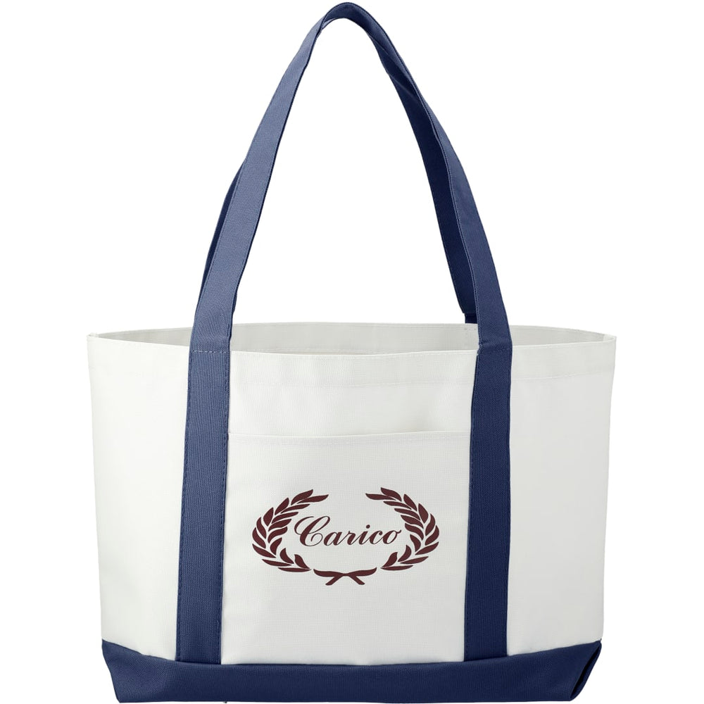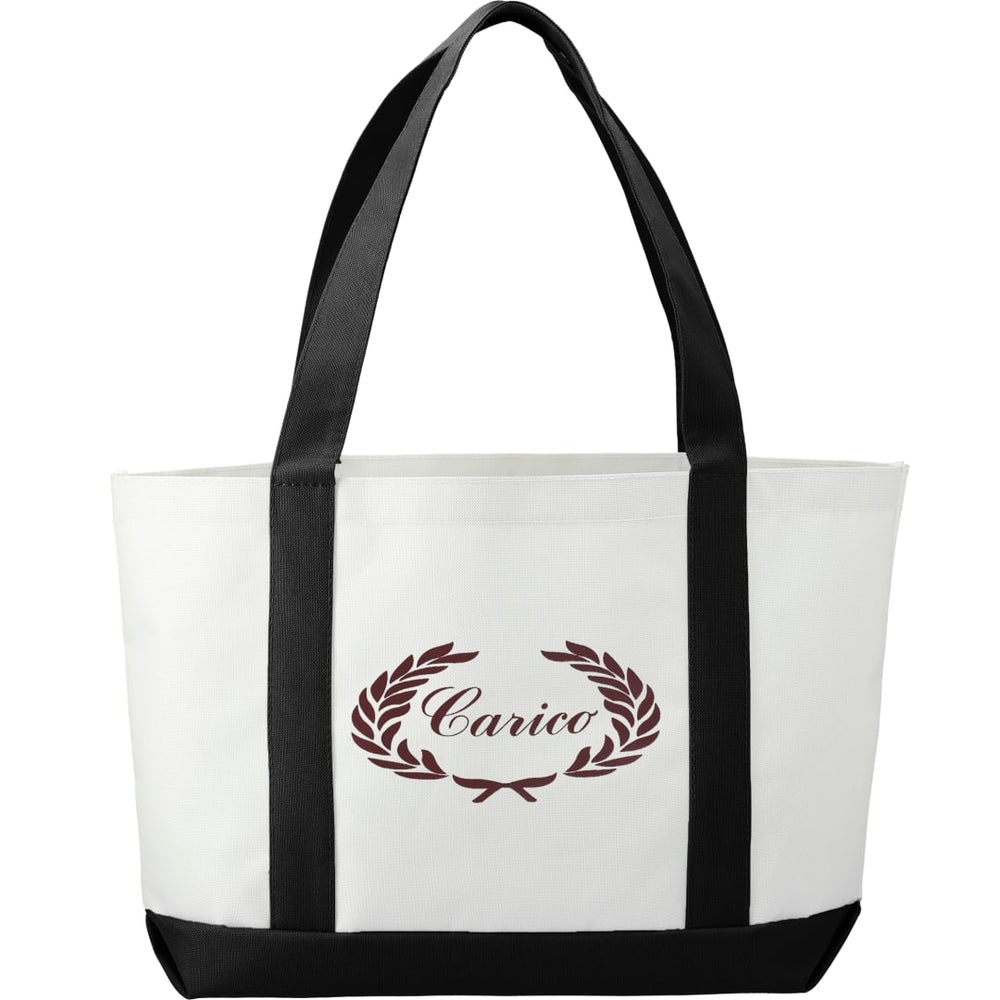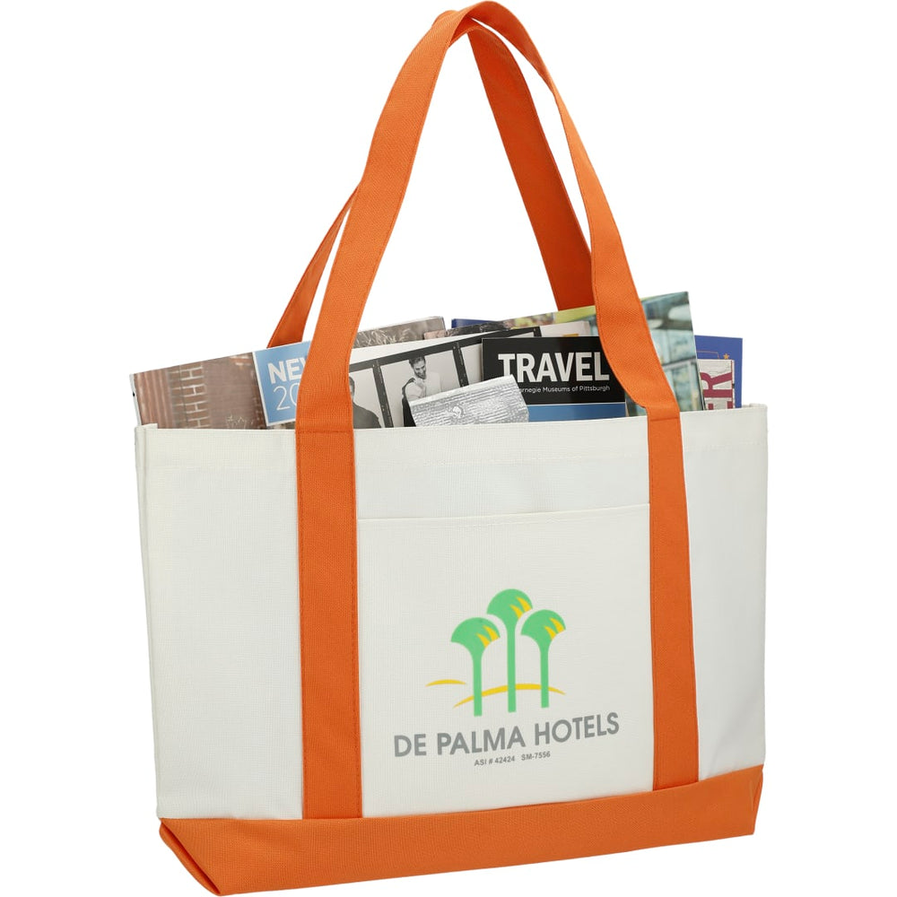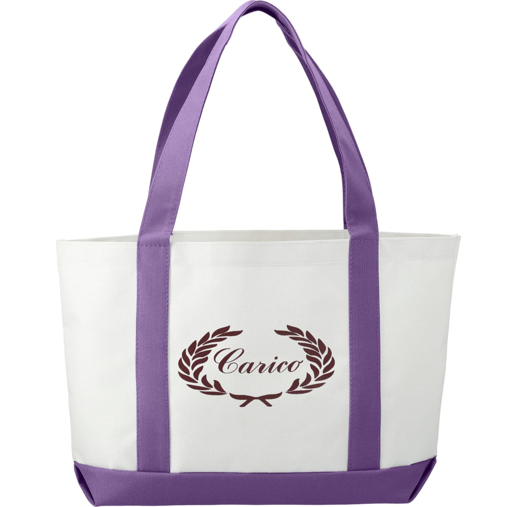 The Large Boat Tote has a large open main compartment with an open front pocket and double 23 inch handles. Disclaimer: Gusset & Handle Decorating is Transfer Only and does not qualify for one day return.