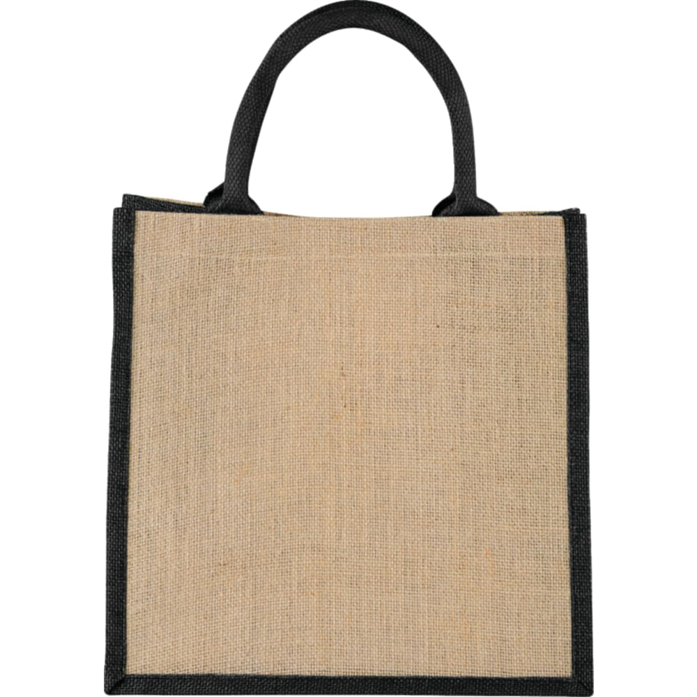 The Medium Jute Gift Tote features an open main compartment with a hook and loop closure and double 14" handles. Disclaimer: Minimum of 32pt. font size. Bold artwork only. No fine graphics or text.