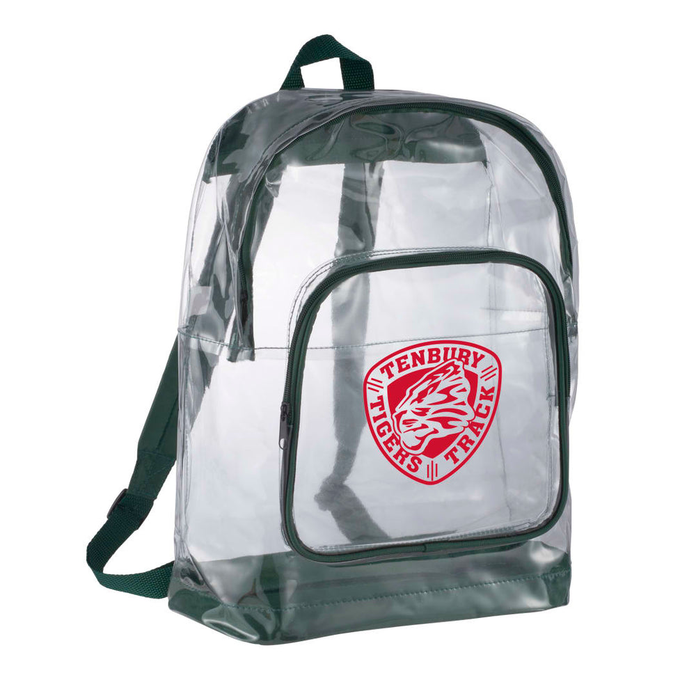 The Rally Clear Backpack has transparent material that makes this bag perfect for stadium, event, workplace and other safety purposes. The large zippered main compartment features a reinforced 210d bottom and a large gusseted zippered front pocket with a protective flap. Adjustable padded shoulder straps and a top carry handle make carrying convenient.