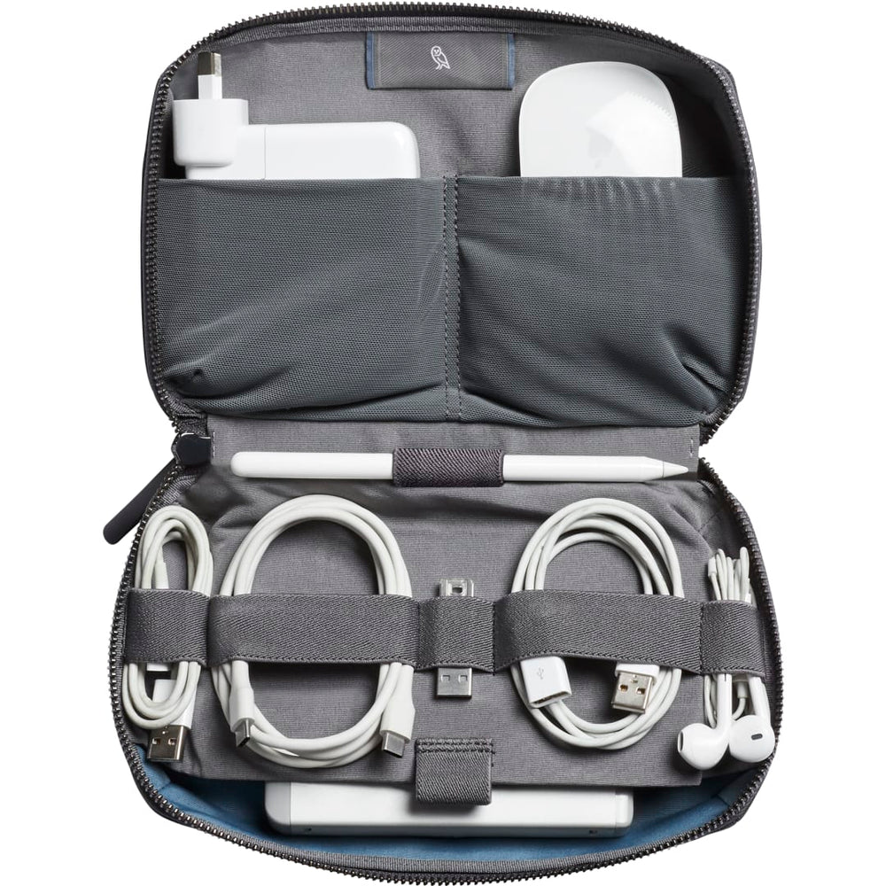 The generously sized Bellroy Tech kit makes it easy to organize your tech accessories without tangles. The case zips open and lies flat for easy access. The signature stretch-mesh pockets and elastic cable organizers keep things in place. The magnetic slip pocket can fit a power bank to keep you charged up on the go. The case is made from recycled woven fabric. Accessories are not included.