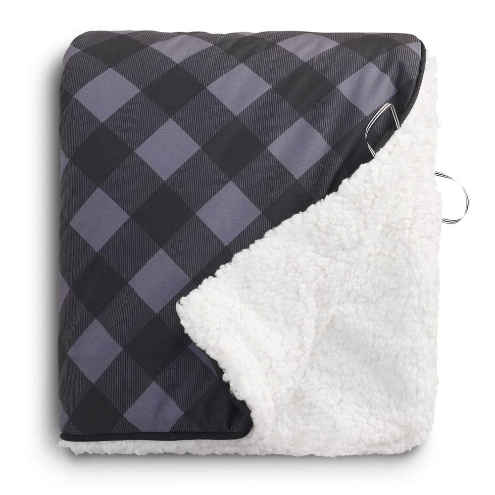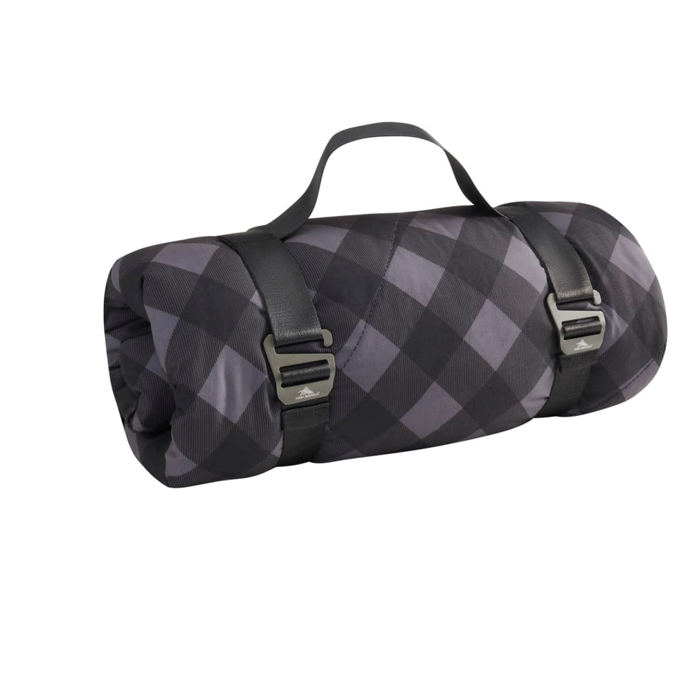 This High Sierra Sherpa blanket is one of the warmest available due to a 3 layer, quilted design that makes it perfect for indoor and outdoor use. Top layer is water resistant and a trendy plaid design, middle layer is cotton insulation, and under layer is a cozy Sherpa. Rolled up in a convenient package with nylon straps and laser engraved High Sierra aluminum clips, this blanket can travel with you anywhere. Blanket measures 50" x 60" unfolded and 10" x 14" folded. This blanket is spot clean only.