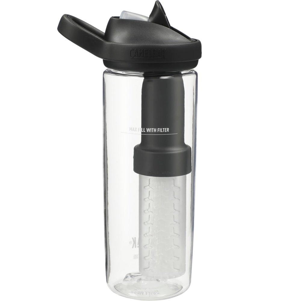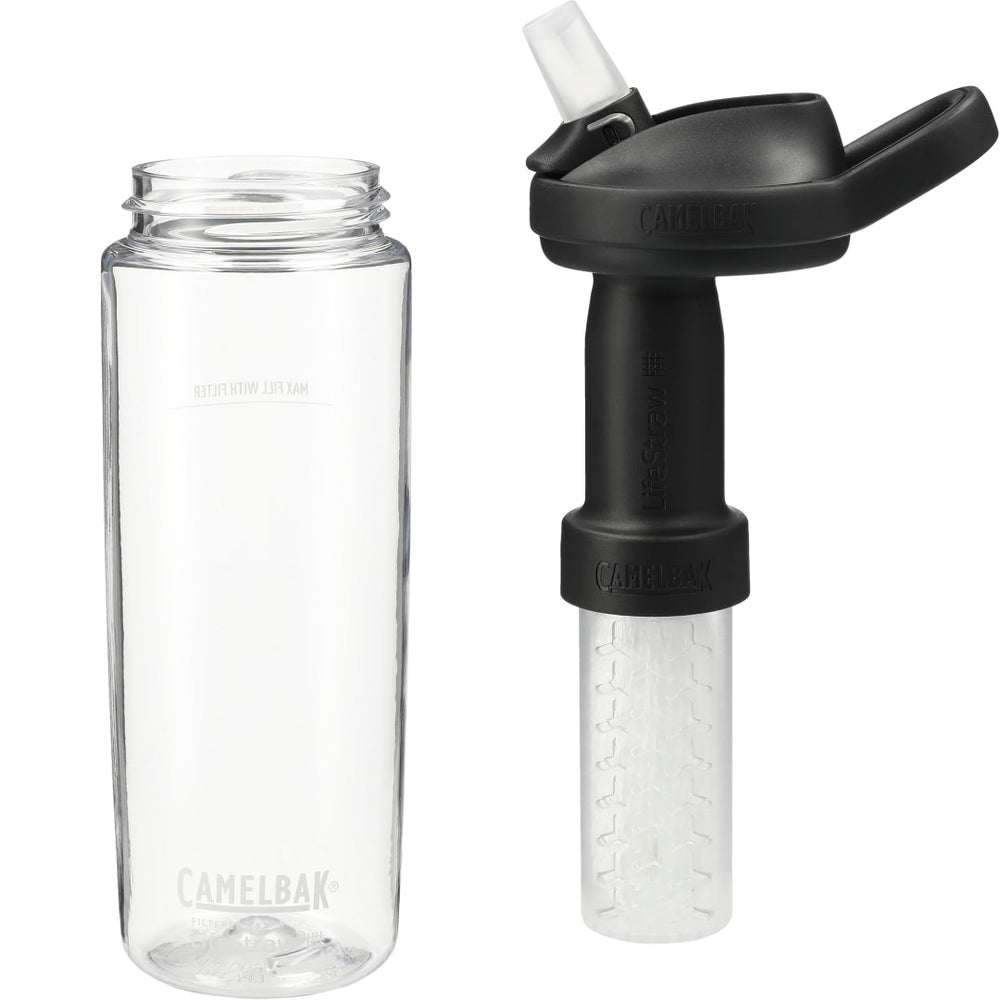 The CamelBak® eddy®+ 20oz w/ Tritan™ RENEW water bottle is made from Eastman Tritan™ RENEW, a durable and sustainable material containing 50% recycled plastic. The bottle is shatter-, stain- and odor-resistant, and its wide mouth makes it easy to fill or clean. Enjoy spill-proof sipping at work or on the trail thanks to the screw-on lid with bite valve and one-finger carry handle. This 20oz eddy®+ water bottle features the built-in LifeStraw, which gives adventurers the convenience of home hydration wherever they roam. The LifeStraw Filter includes the Ion Exchange Filter and the Hollow Fiber Filter. BPA-free. Leed’s exclusive. 20oz. Replacement Filters are available on WWW.CAMELBAK.COM.