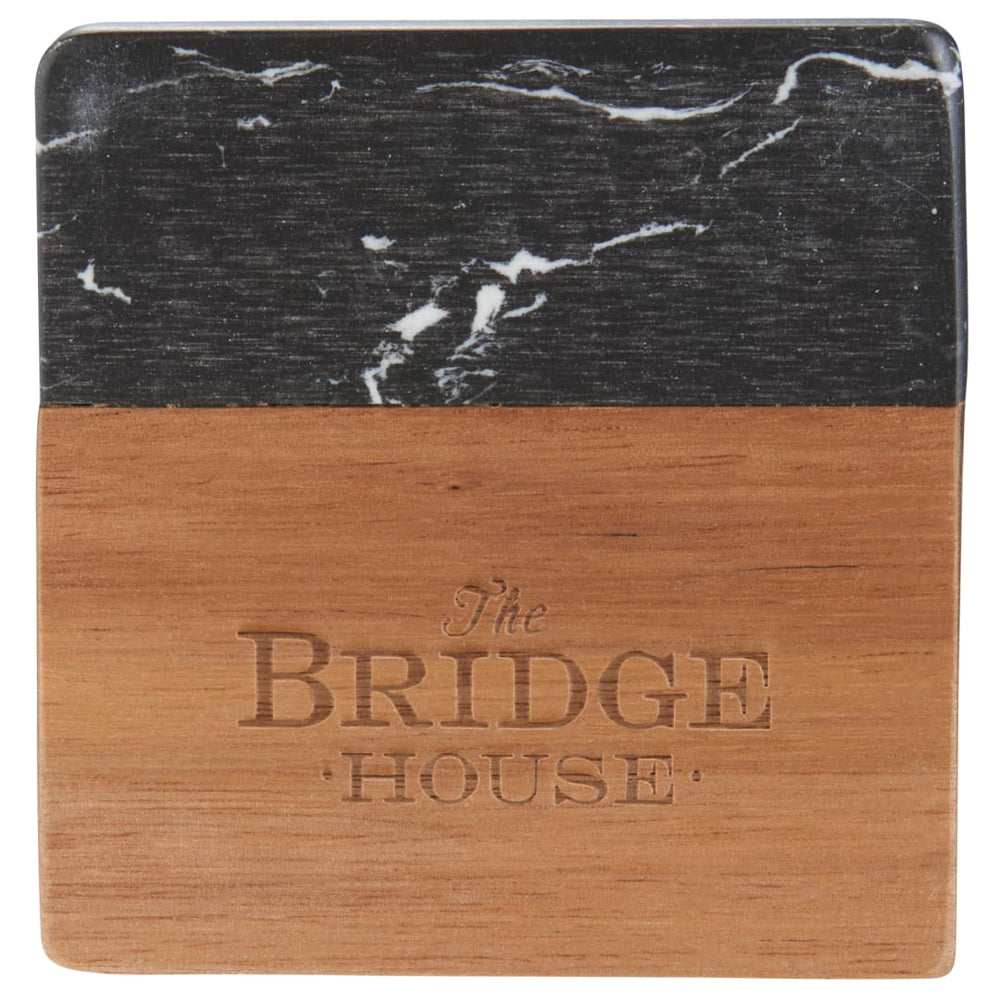 This on trend coaster set is crafted from marble and acacia wood. The coasters are square with rounded corners. These chic coasters are perfect for the home or office. Decoration on all four coasters. Due to the natural material variations in the marble pattern and laser imprint will occur.