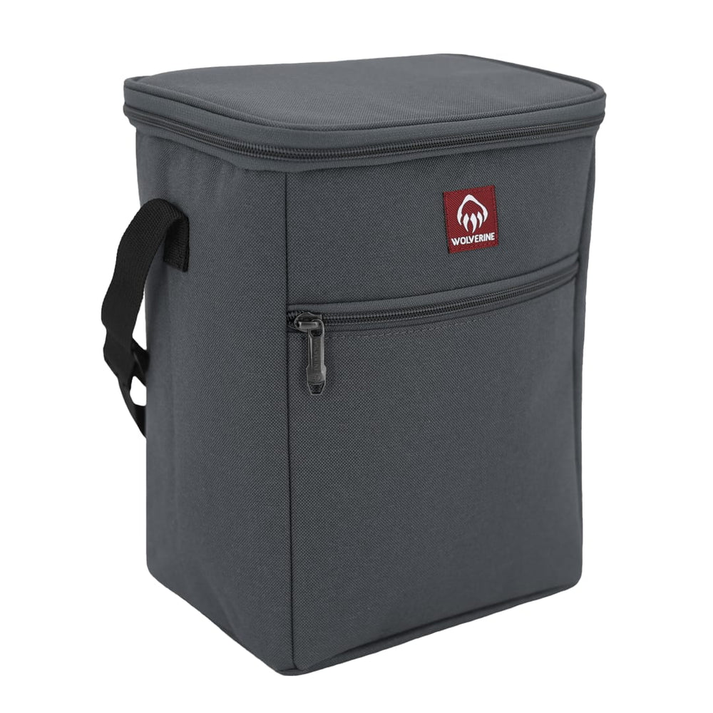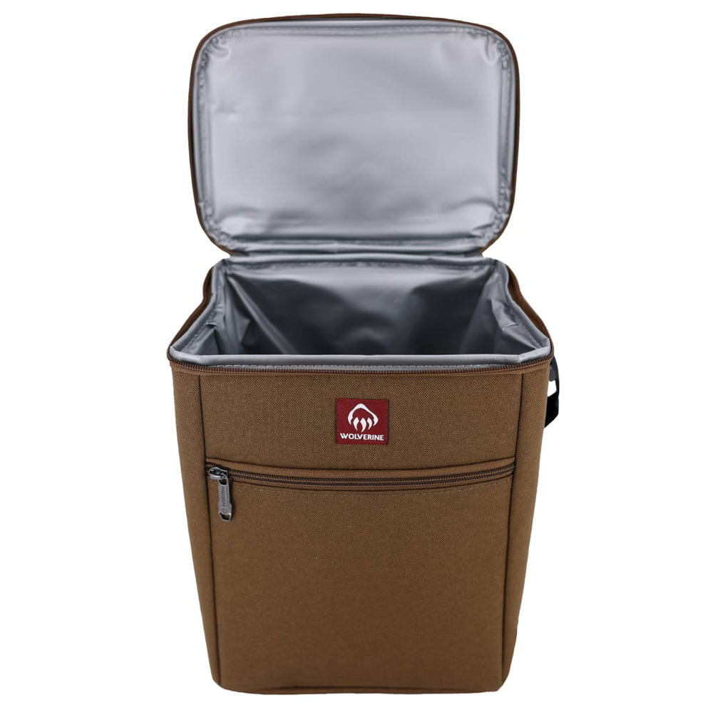 The Wolverine Vertical 12 Can Cooler is crafted with rugged High-Density Canvas and a DWR coating to repel dirt and water. The large insulated compartment holds food or 12 cans. Front pocket and shoulder strap offer extra storage and easy-carry convenience.