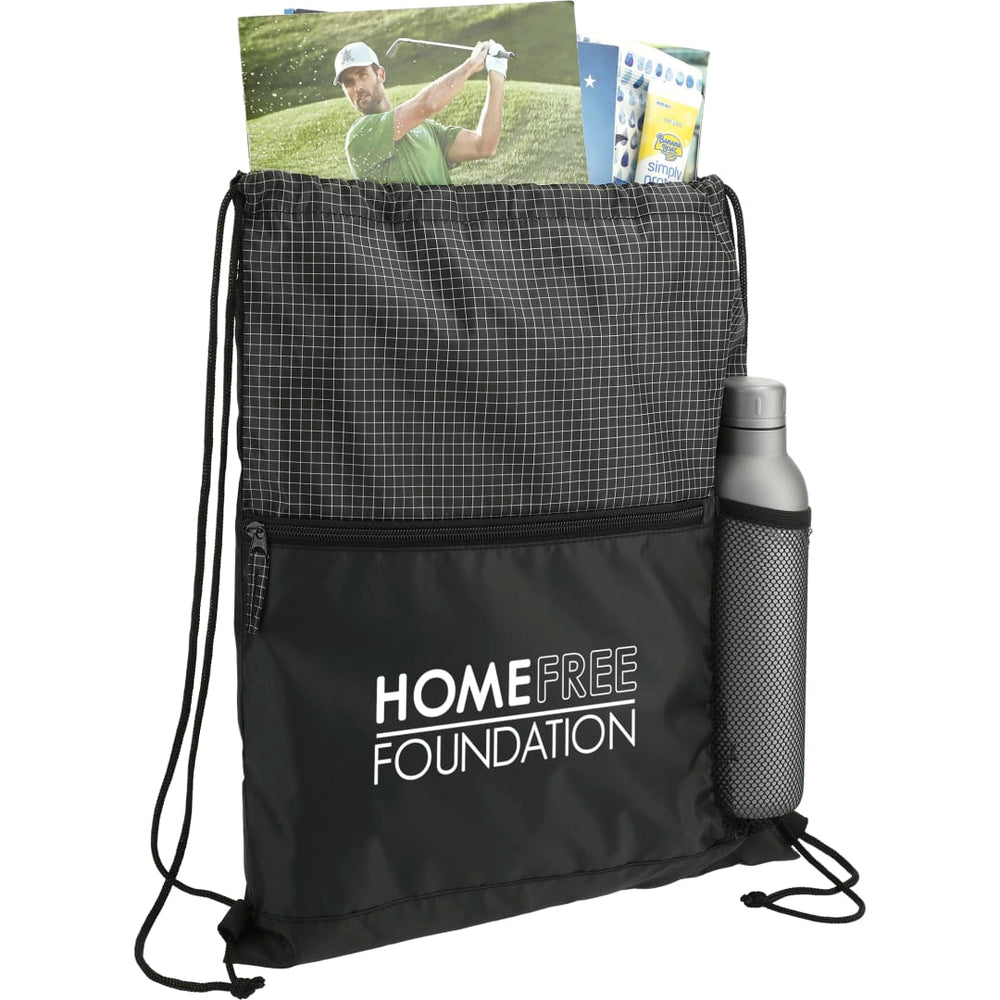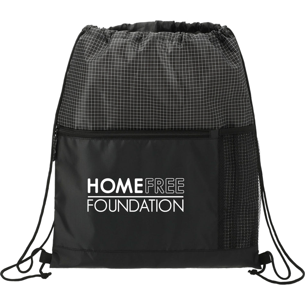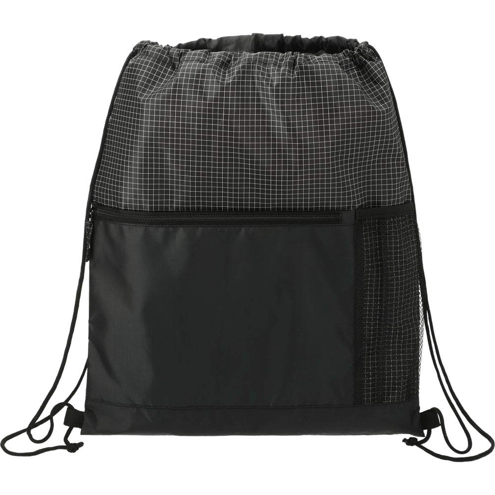 The Grid Drawstring features a drawstring closure main compartment and a zippered front pocket.