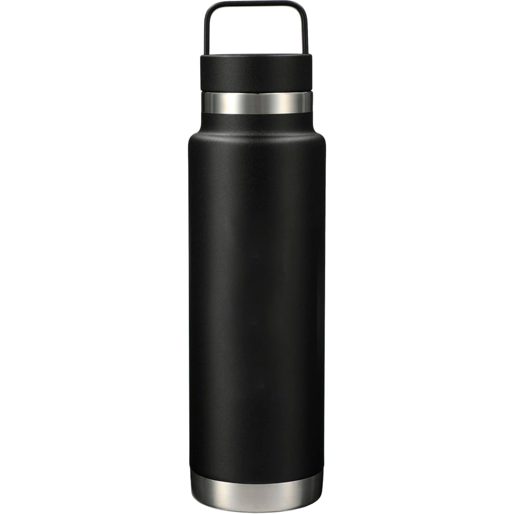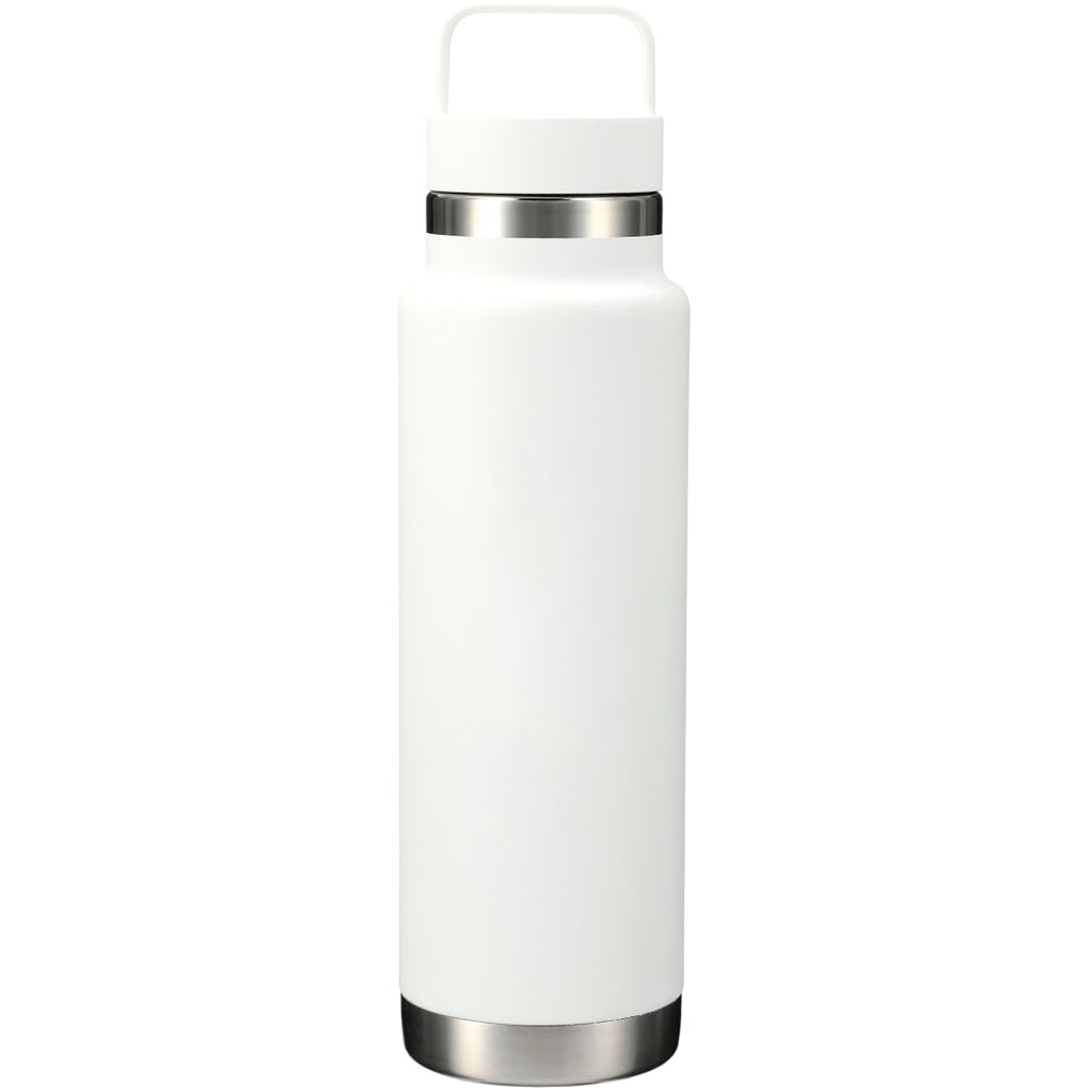 All stainless steel product with silicone gasket. Durable, powder spray coating. Double-wall stainless steel vacuum construction with copper insulation, which allows your beverage to stay cold for 48 hours and at least 12 hours for hot beverages. The construction also prevents condensation on the outside of the bottle. Durable, screw-on, spill proof lid with easy carry metal handle. Wide mouth opening for easy cleaning and filling. Leed's exclusive. 20oz.