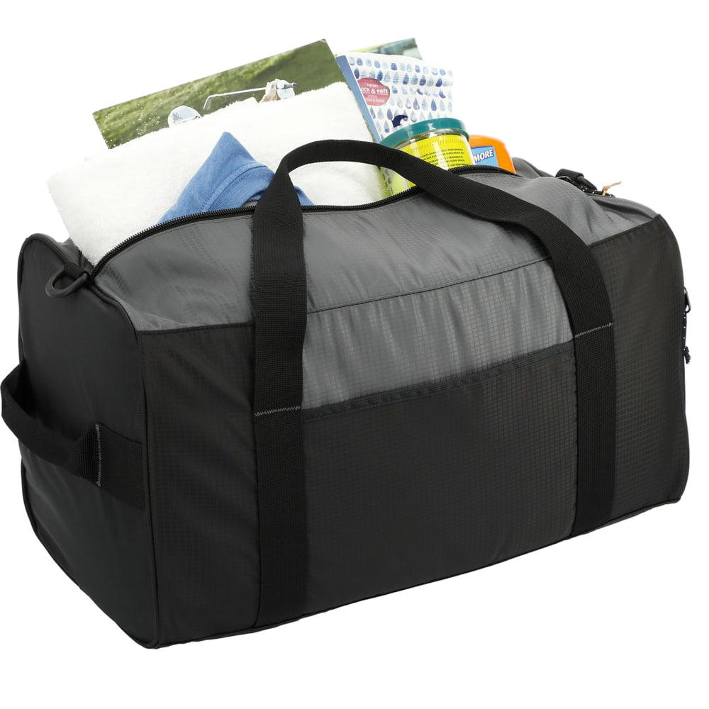 The NBN Trailhead Recycled Duffel features a roomy zippered main compartment as well as a zippered interior pocket. The side-webbing grab handle, top-webbing grab handles and adjustable, removable shoulder strap offer different ways to carry this recycled duffel. Keep your essential items in the zippered side pocket and the front slash pocket. Use the interchangeable zipper pulls for a custom look. Through a partnership with 1% For The Planet, one percent of sales of all EcoSmart® products are donated to environmental nonprofits.