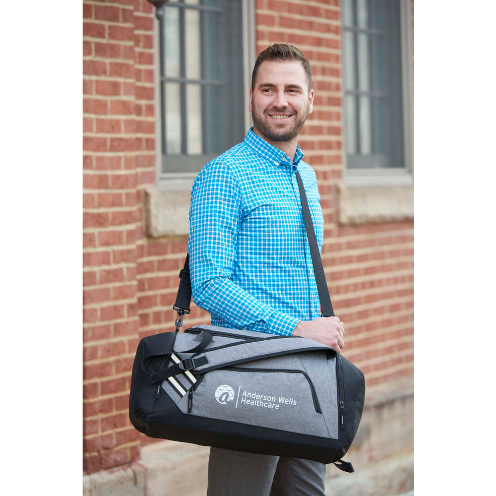The Sebring Convertible Graphite Duffel gives you the best of both worlds - a duffel AND a backpack. This sporty convertible duffel features a roomy zippered main compartment, one side zippered pocket, reflective accents, a side zippered shoe pocket, and a front zippered pocket. The back includes a large mesh water bottle pocket.