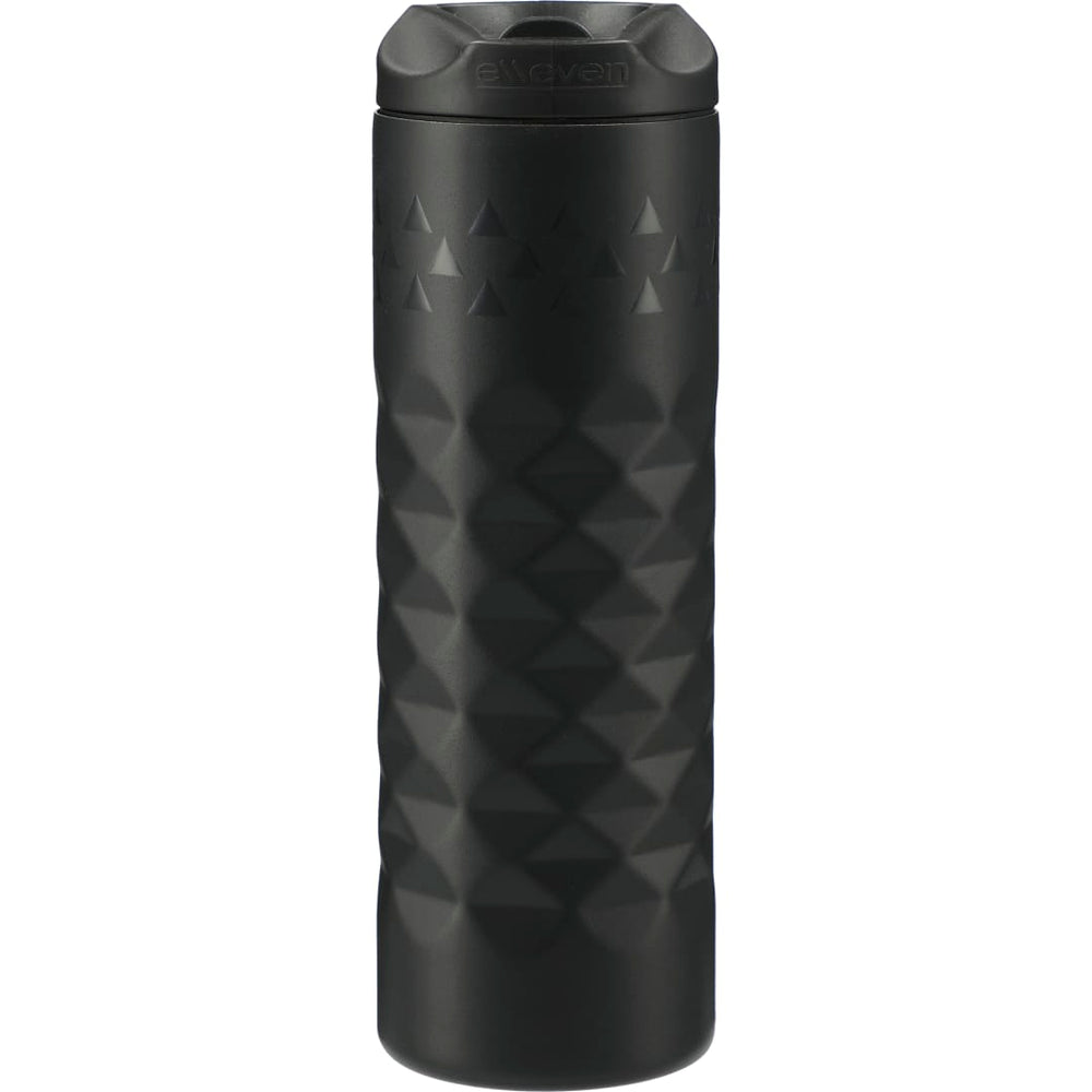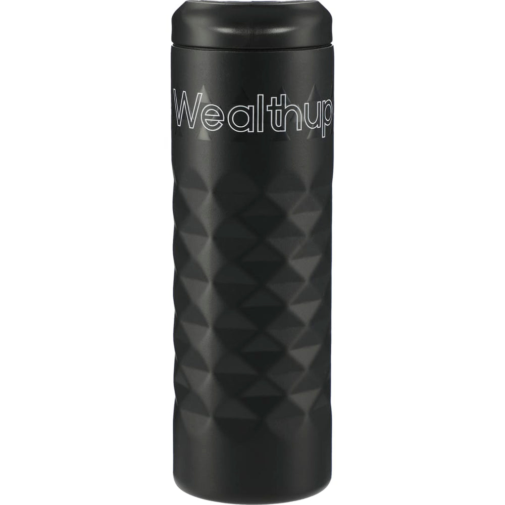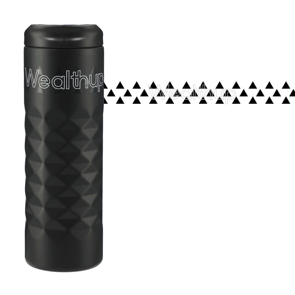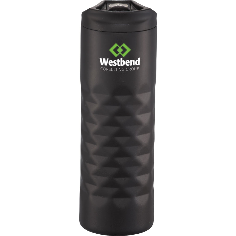 Design features an intricate geometric cut. Leak-Proof designed slide open lid. Double-wall copper vacuum insulated stainless steel construction. Keeps drinks hot for 8 hours and cold for 24 hours. Trendy, durable powder coating. Leed's Exclusive. 16oz.