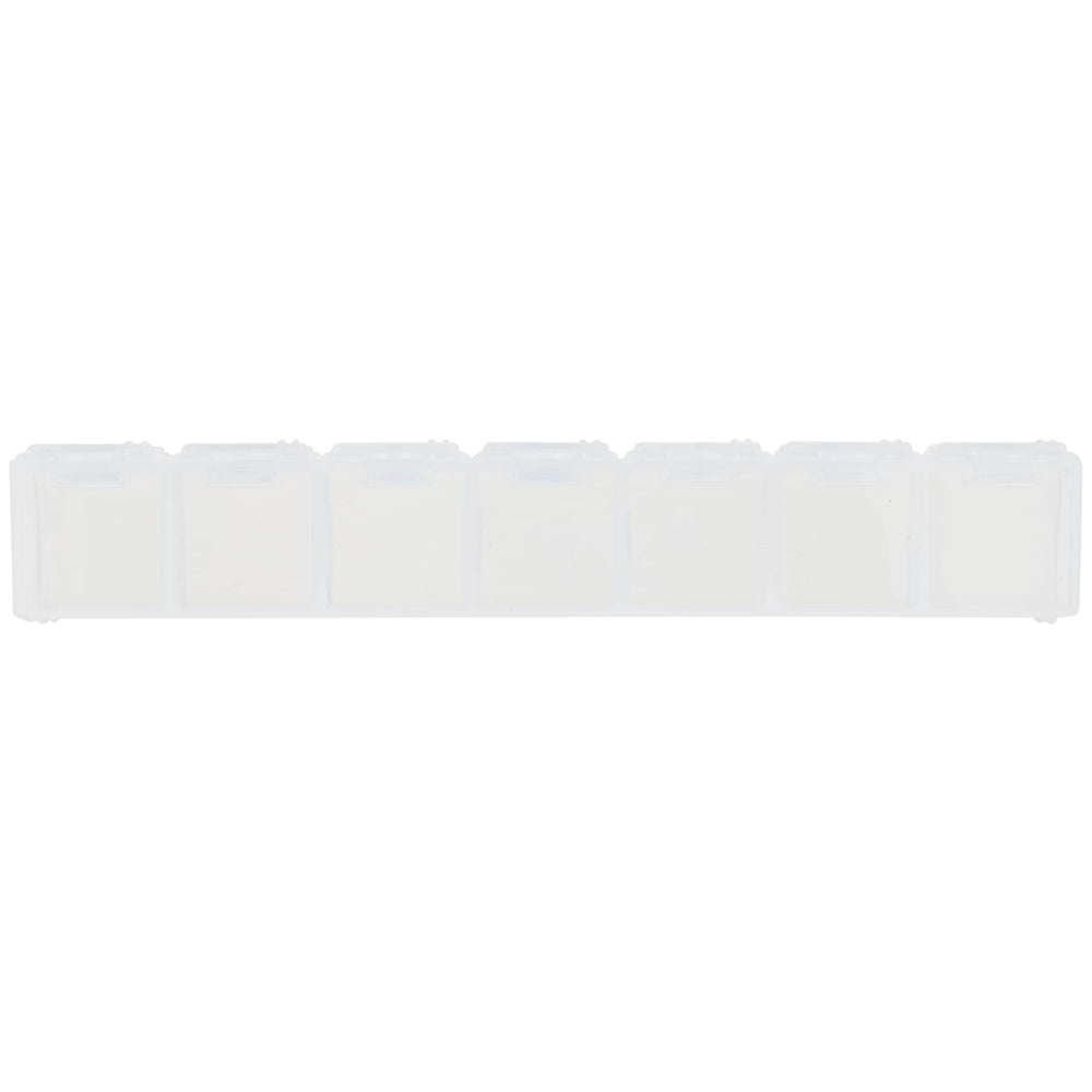 The 7-Day Pill Case is a storage box that features seven compartments and a conveniently labeled day of the week on the hinged, snap-up lid.