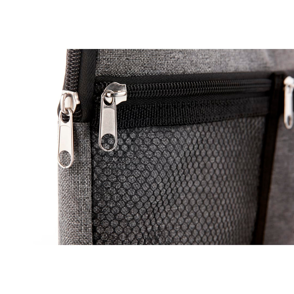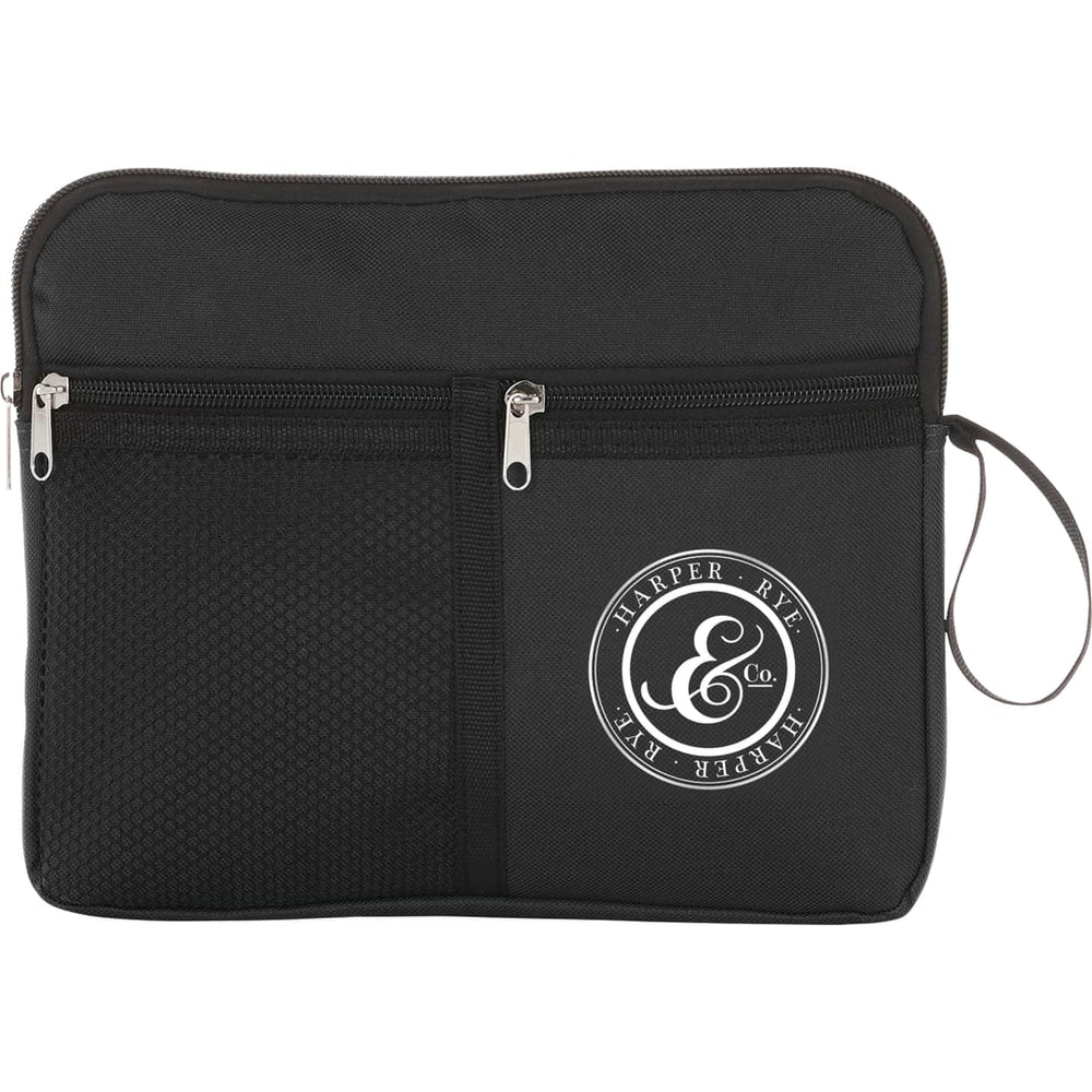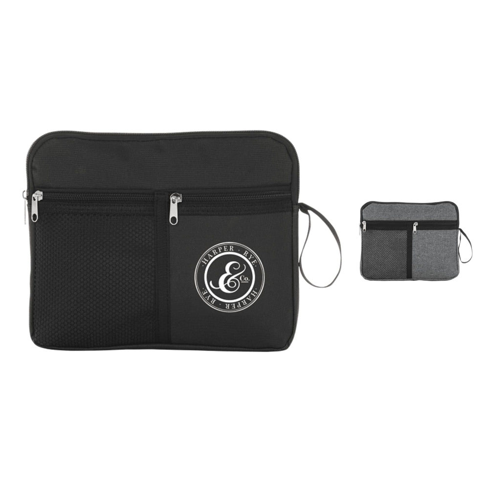 The Multi-Purpose Travel Bag is ideal for toiletries, cosmetics or other travel necessities. It features a zippered top pocket, front mesh pocket and a side loop.