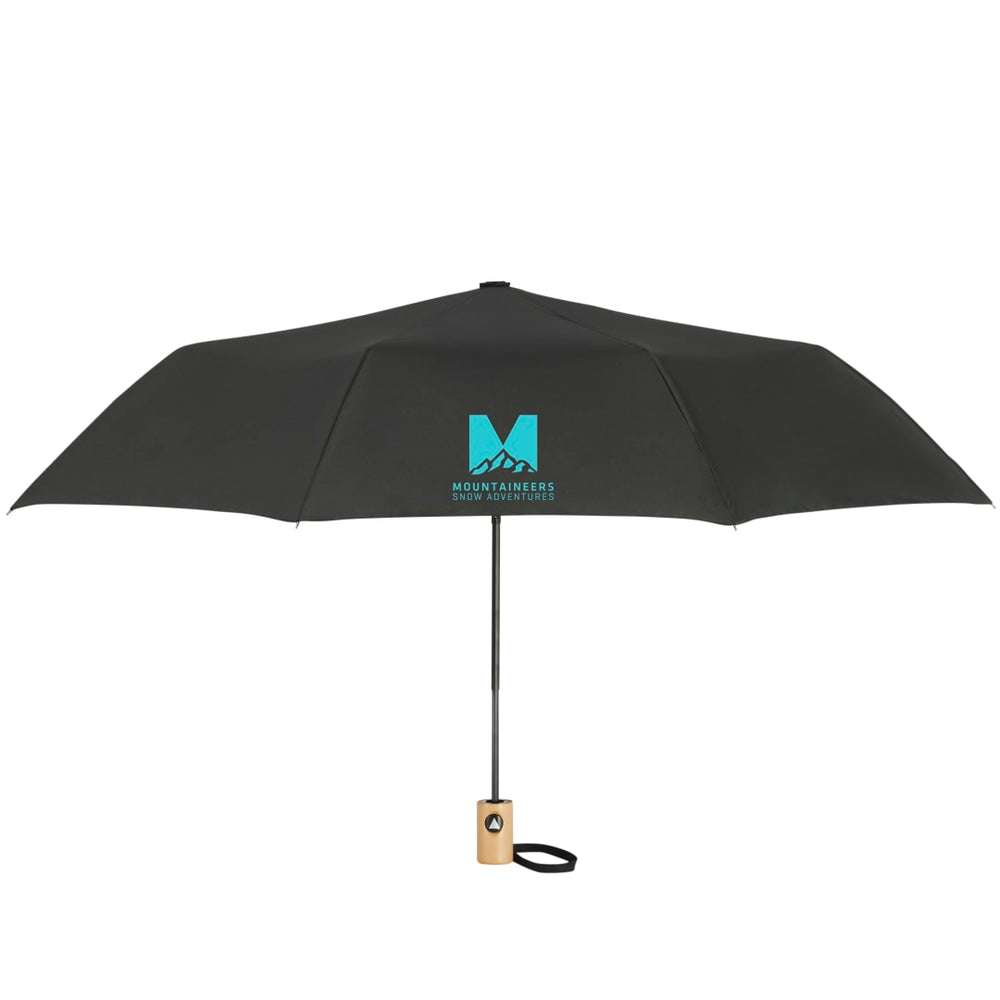 The 42" Folding Auto Open Umbrella is the perfect size. This umbrella is made metal and fiberglass and features and FSC wood handle with ABS button. It's easy to store with it's matching RPET sleeve that comes in an FSC pouch! Wind rated up to 25mph.