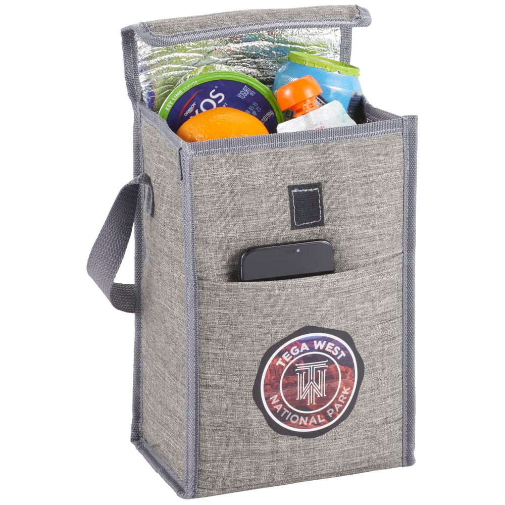 This cooler features a 100% rPET outer main material. Top fold-over style reminiscent of a paper lunch bag and includes a grab handle. Note: Foil lining, webbing handle and webbing trim are not made with recycled materials. This cooler features an interior ID label for easy identification. Through a partnership with 1% For The Planet, one percent of sales of this and all EcoSmart products will be donated to nonprofits dedicated to protecting the planet.