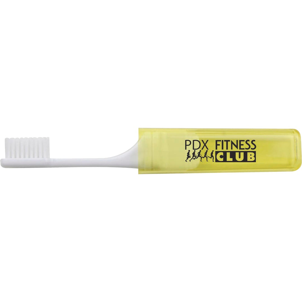 The Travel Toothbrush has a bristle head that stores inside the handle, making it perfect for travel. This white toothbrush comes in an assortment of different colored handles and is only available for shipment within United States (including Alaska, Hawaii & Puerto Rico). Less than minimum are orders not available. FOB ZIP: WI, 54703.