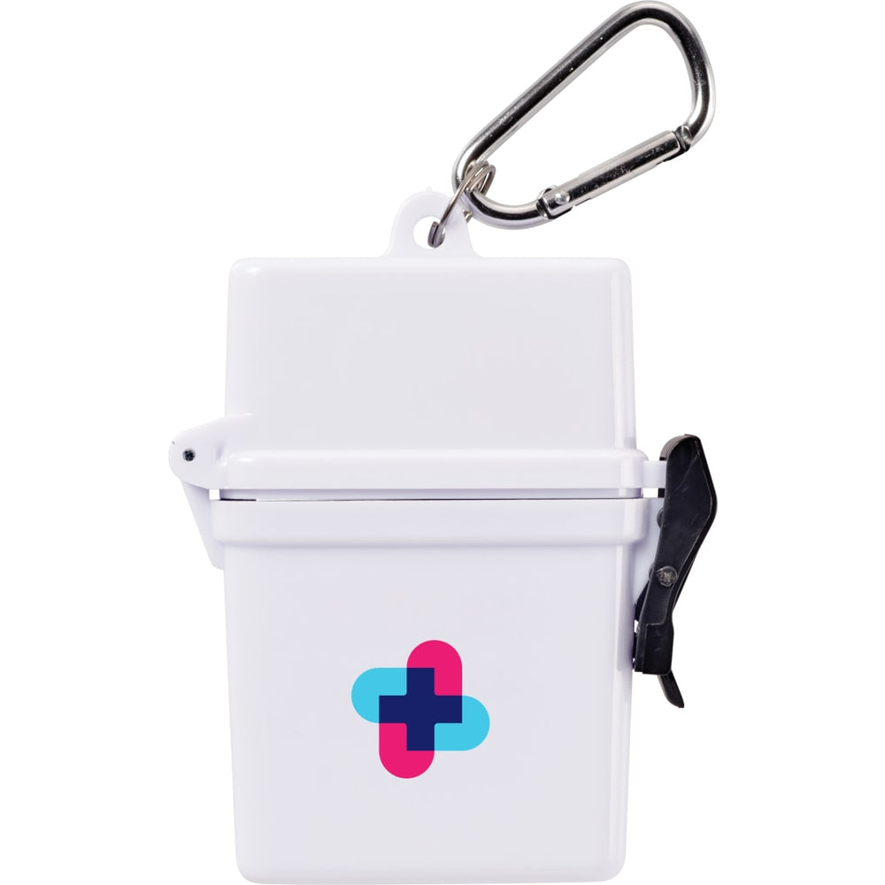 The Trek 8-Piece Waterproof First Aid Kit is a mini first-aid kit in a flip-top waterproof floating container with metal mini-carabiner for convenient first aid care. The kit includes 2 adhesive bandages, 2 antiseptic wipes, 1 Hand Sanitizer packet, (2) SPF30 Sunscreen packets and 1 aloe/after sun care packet. Sunscreen does not contain Octinoxate or Oxybenzone. Meets FDA requirements and is available for shipment within the United States (including Alaska, Hawaii & Puerto Rico). Not available for export. See General Information page for additional air shipment charges. Not available in Canada.
