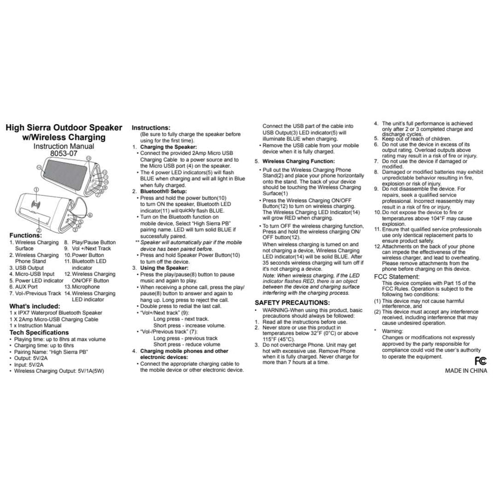 No matter the location you can count on the High Sierra Waterproof Bluetooth Speaker and Wireless Powerbank to deliver. With an IPX7 Waterproof rating the Bluetooth speaker can be submerged underwater for up to 30 minutes. The Bluetooth speaker features a rechargeable 8000mAh battery that provides up to 8 hours of playback time at max volume. The speaker can also be used to charge your mobile device with the built in USB Output or with the built in wireless charging powerbank. Your phone must be compatible with wireless charging. Two devices can be charged at the same time while you enjoy your favorite music. Once your journeys over this Bluetooth speaker makes a great desktop speaker with built in music controls and a microphone for hands free calling. With stereo sound (2 x 3 Watt) the speaker will be heard around the camp site or conference table. Bluetooth Version 5.0. Charging Time: Up to 6hrs. Bluetooth working range is 10 meters (33 feet). Micro USB Charging Cable provided.