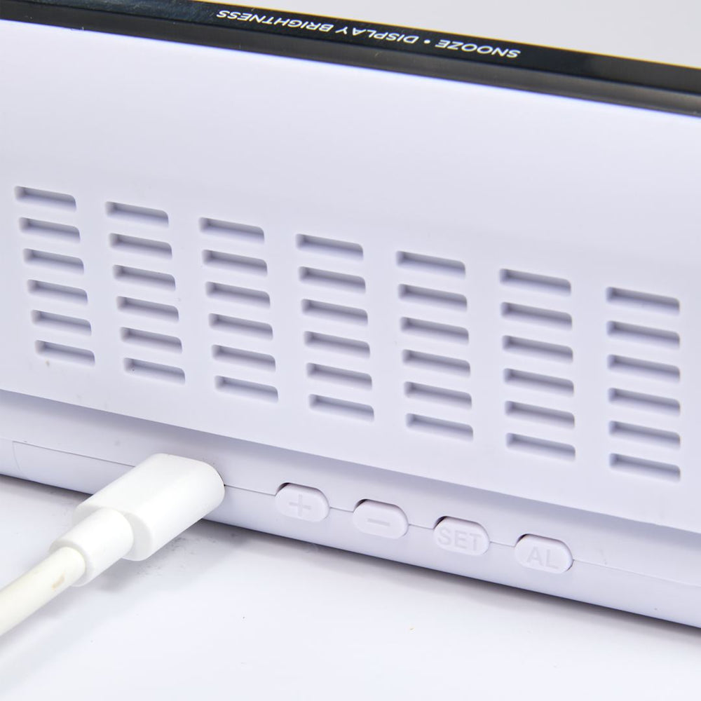 The Digital Power Clock is a sleek, adjustable digital alarm clock that incorporates a powerful 15W wireless charger, and has a compact, foldable design for easy travel and storage. Offering up to 15W of wireless power for Android devices and up to 7.5W for All iPhone 8/X/11/12/13/14/15 Series. Compatible with most plastic phone cases, this charger includes a 39-inch Type-C to Type-C cable. For optimal performance, it is recommended to use a UL or ETL Listed 20W USB-C power adapter.