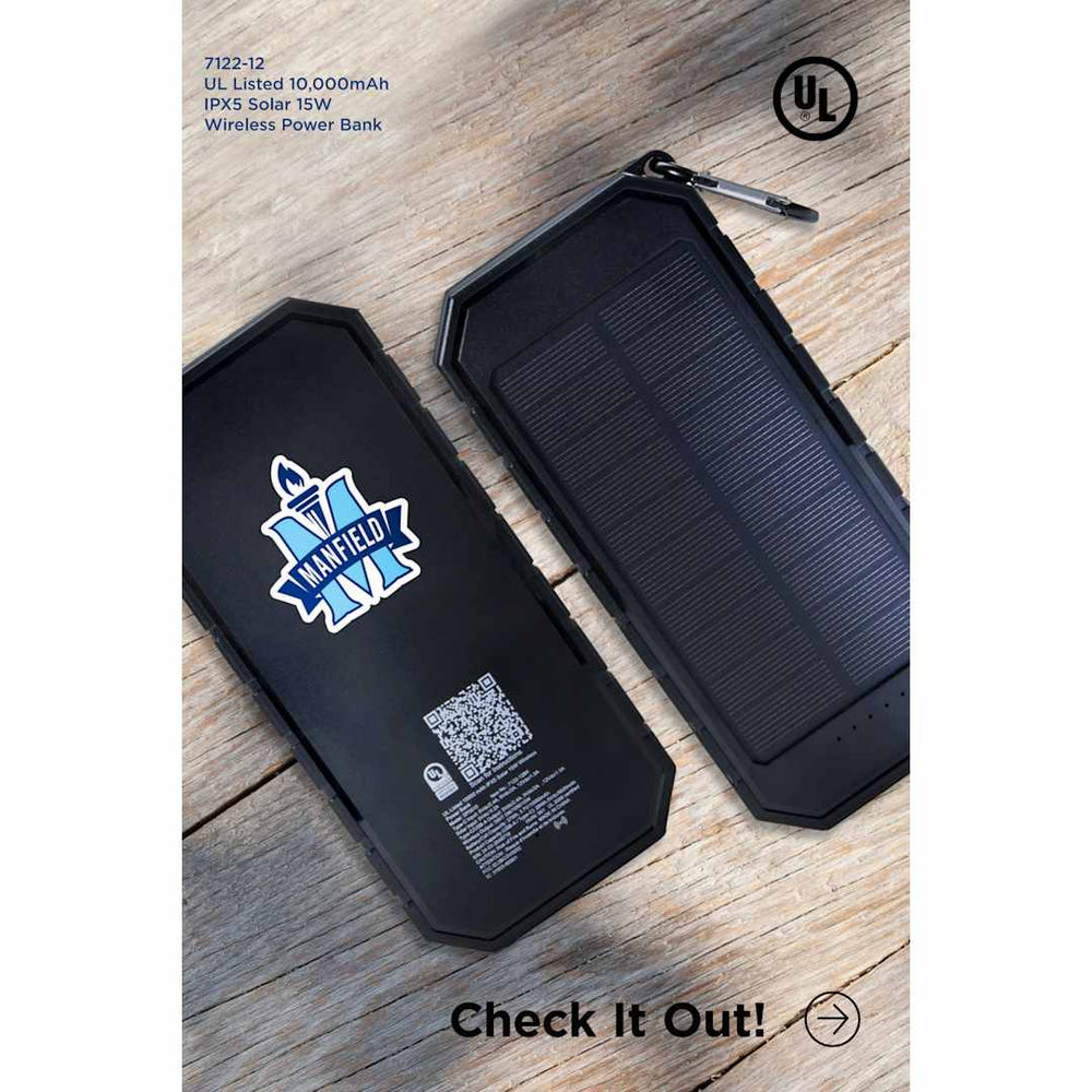 The UL Listed 10,000 IPX5 Solar 15W Wireless Power Bank is the ultimate on-the-go power solution. With a 10,000 mAh/37Wh rechargeable lithium polymer battery and a lightning-fast 15W wireless charging pad, it keeps your devices powered up effortlessly. Boasting versatile Type-C Input/Output and USB-A Output, it's compatible with a wide range of devices. Its built-in solar panel ensures you're never left powerless, while the included carabiner lets you conveniently attach it to your bag for easy access. Engineered with an IPX5 waterproof rating, it's ready to tackle any adventure. Included a 39-inch Type-C-to-Type-C charging cable and packaged in an FSC®-certified premium gift box. The color of the solar panel may vary from every batch. Power banks are permitted in carry-on luggage only, and at the discretion of TSA agents. Please charge power bank before initial use. The power bank will need 45 hours of direct sunlight to fully charge the power back through the solar panel only.