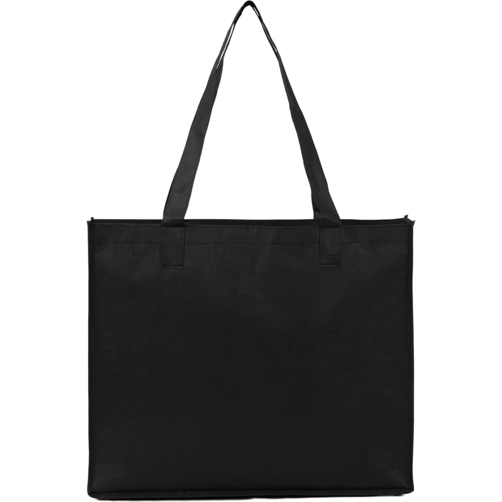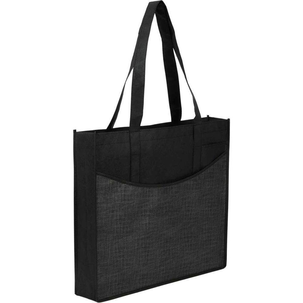 The Brooke Recycled Non-Woven Convention Tote is a fun take on the traditional convention tote. Featuring a fun pop of color this tote will surely stand out. With a fun swoop front pocket and pen slots this tote is all you need for your next show! Made with recycled materials this tote gives 1% to the Planet!