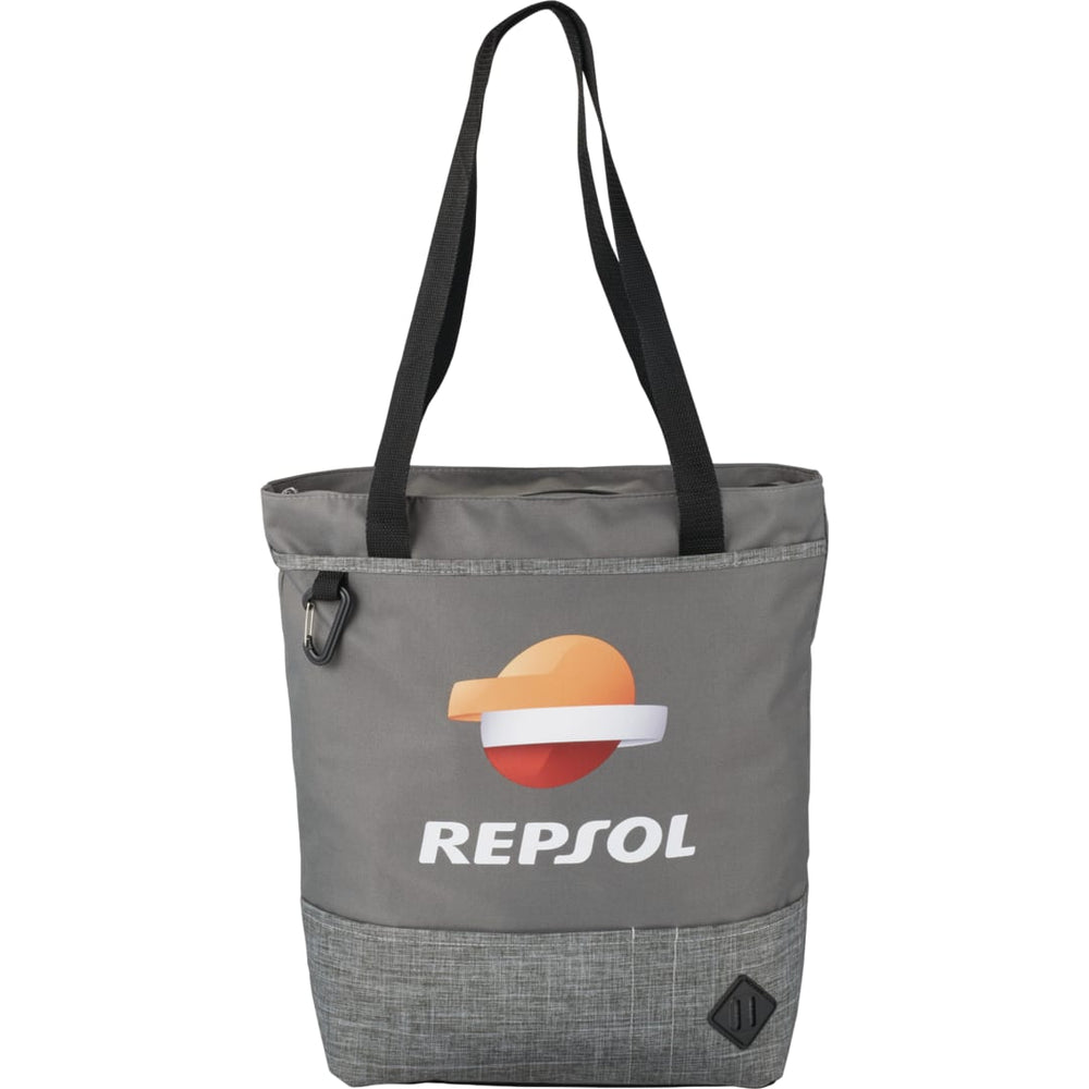 This is the ideal trendy convention tote. Zippered main compartment. Hook and loop closure front slash pocket. Phone and organizational pockets running along the base of the tote including a pen slot. D-ring and added corner detail to hang keys or water bottle. 14.5" handle drop height. Disclaimer: There may be minor variations in color of the actual product due to the nature of the fabric dyes, weaves and printing.