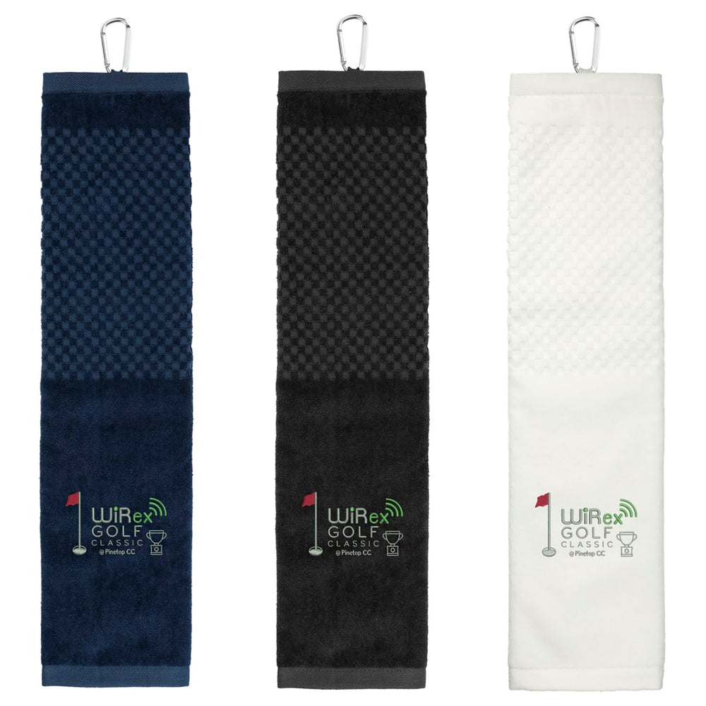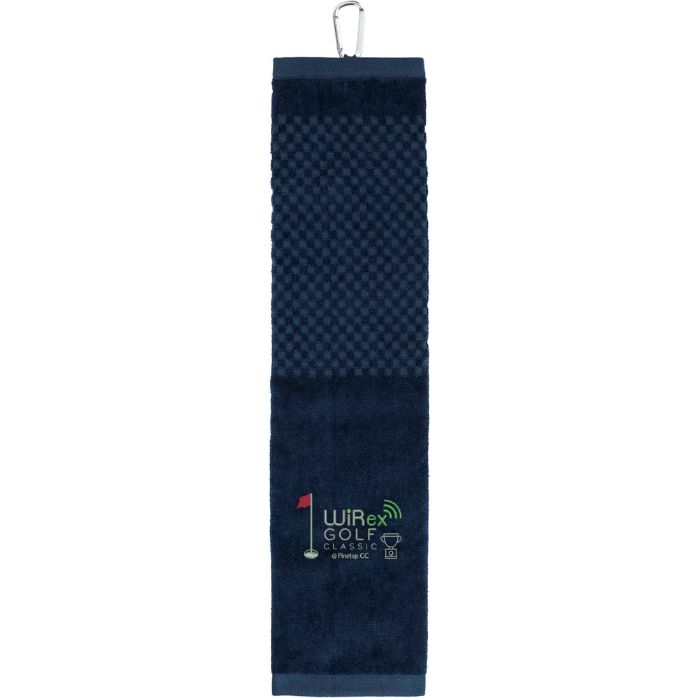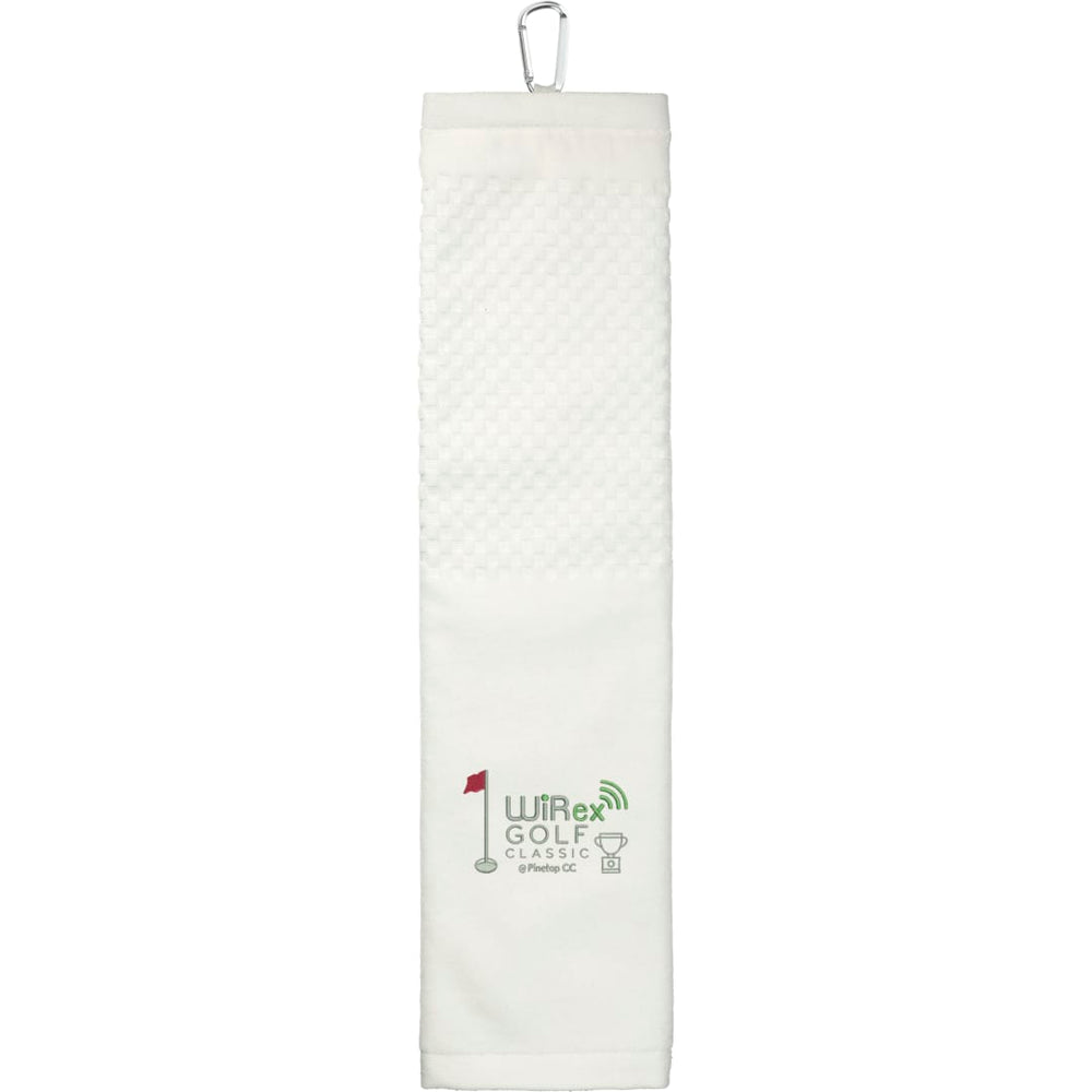 This heavyweight 3.5lb/dozen golf towel is 100% cotton and has a tri-folded design for scrubbing your golf balls and clubs. Comes with a grommet and aluminum carabiner clip for attaching to your golf bag. Free embroidery run charges on up to 10,000 stitches.