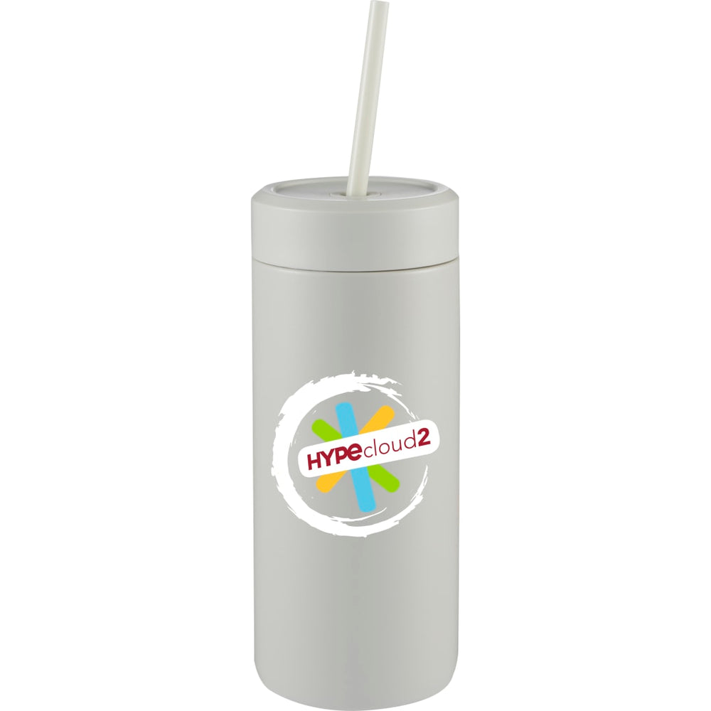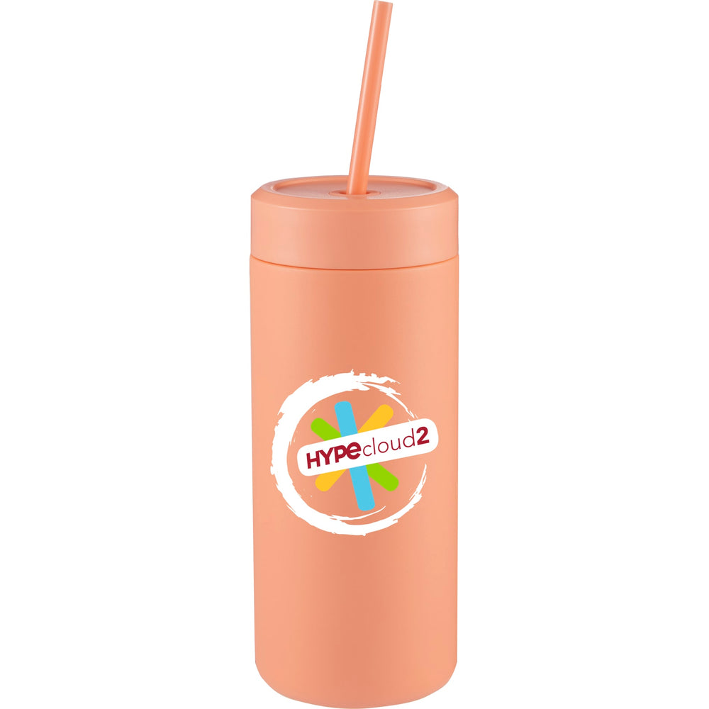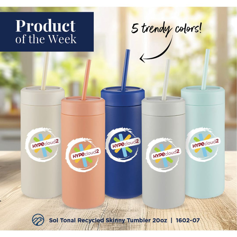 The Sol Tonal Recycled Skinny Straw tumbler has a popular skinny tumbler shape and comes in a variety of on-trend colors. Made from 91% recycled stainless steel and includes a 100% recycled PP straw and lid, the Sol is a sustainable upgrade at a great price. Featuring double wall insulation that keeps beverages cold for hours, a durable powder coating that offers sweat-proof sipping, and a screw top lid with silicone straw holder that allows you to sip securely without splashes or leaks. Hand wash only.