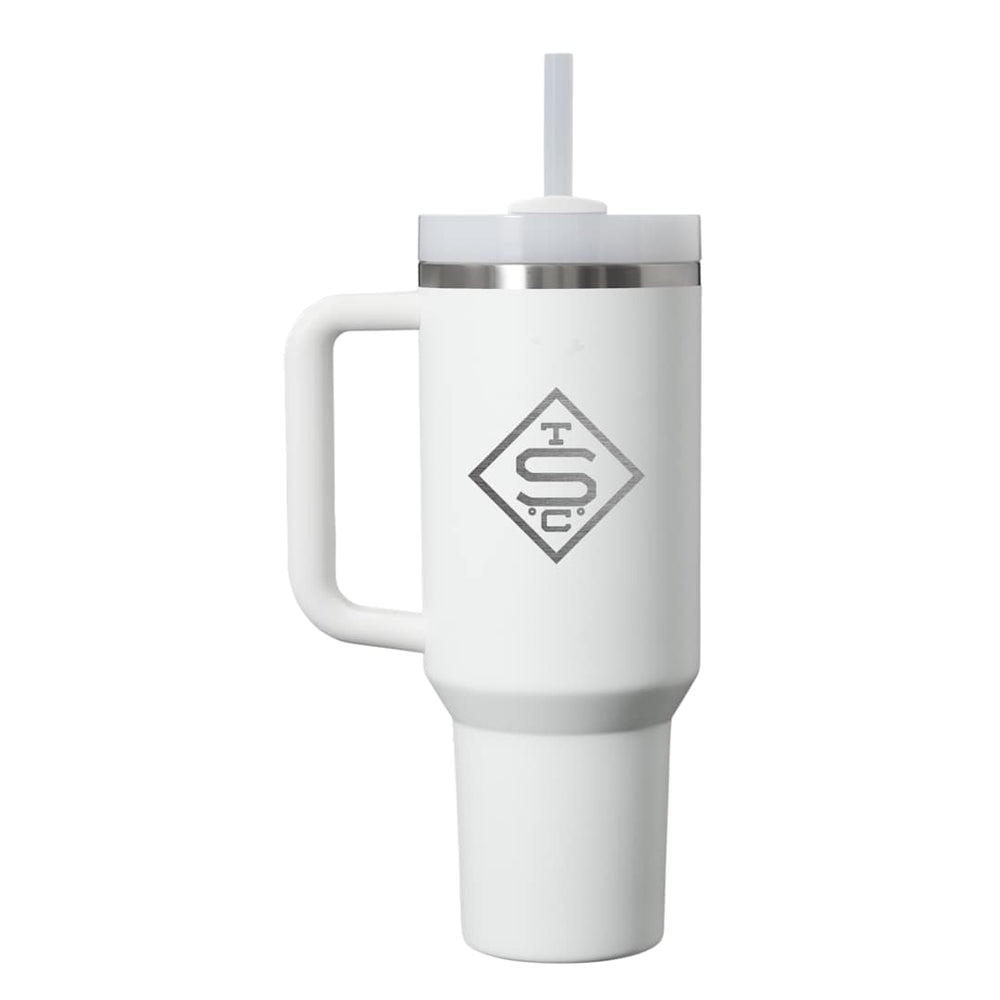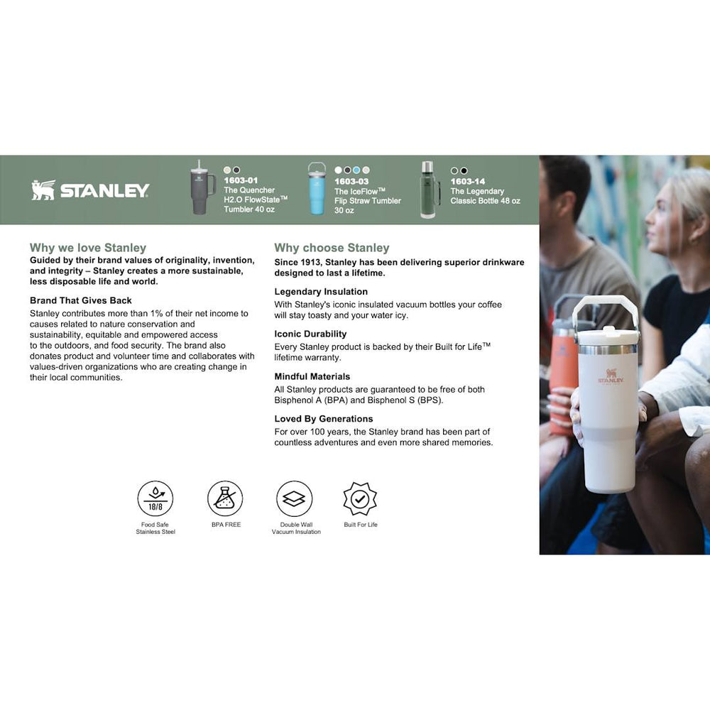 Constructed of recycled stainless steel for sustainable sipping, the 40 oz Quencher H2.0 offers maximum hydration with fewer refills. Commuting, studio workouts, day trips or your front porch—you’ll want this tumbler by your side. Thanks to Stanley’s vacuum insulation, your water will stay ice-cold, hour after hour. The advanced FlowState™ lid features a rotating cover with three positions: a straw opening designed to resist splashes while holding the reusable straw in place, a drink opening, and a full-cover top. The ergonomic handle includes comfort-grip inserts for easy carrying, and the narrow base fits just about any car cup holder. Hand Wash Only.