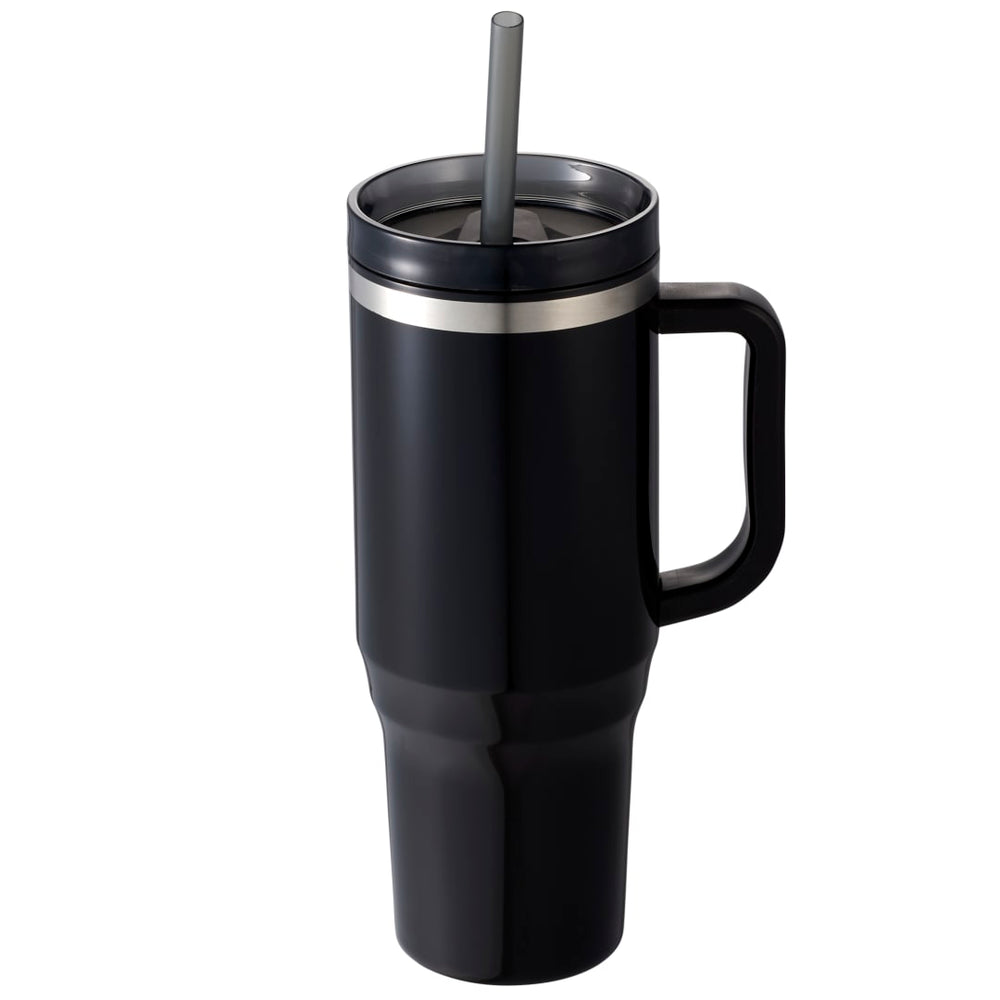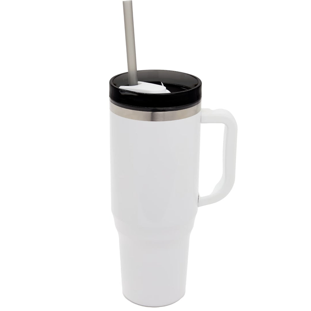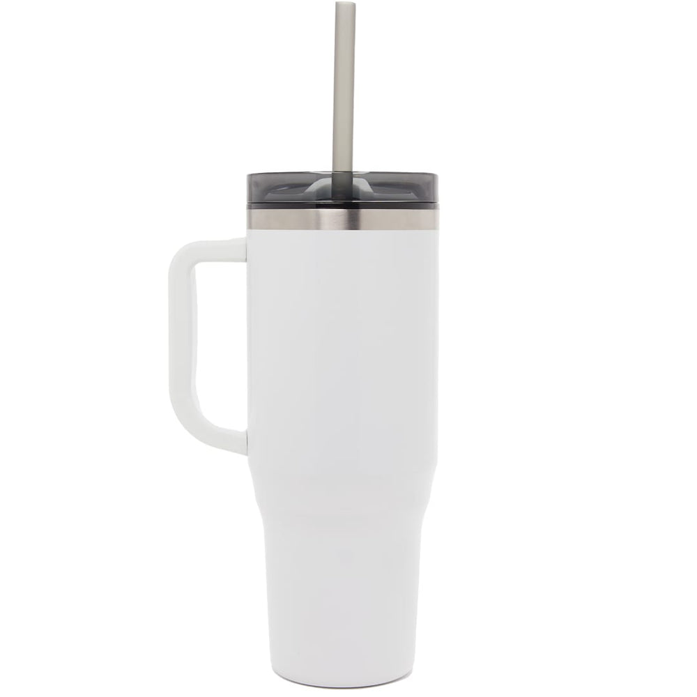 The Bullet Thor 40 oz Eco-Friendly Straw Tumbler features durable double-wall construction to keep your beverages hot or cold in any environment. Food-grade recycled straw included for easy reuse daily. The Thor has a 40 ounce capacity for fewer refills and features a slim base that fits into most cupholders, comfortable carry handle, and splash-proof press-on lid with two openings and a swivel closure, friendly to both Sippers and Chuggers! Hand-wash only.