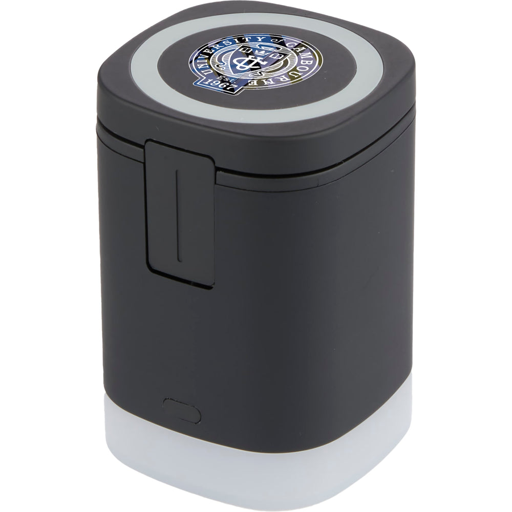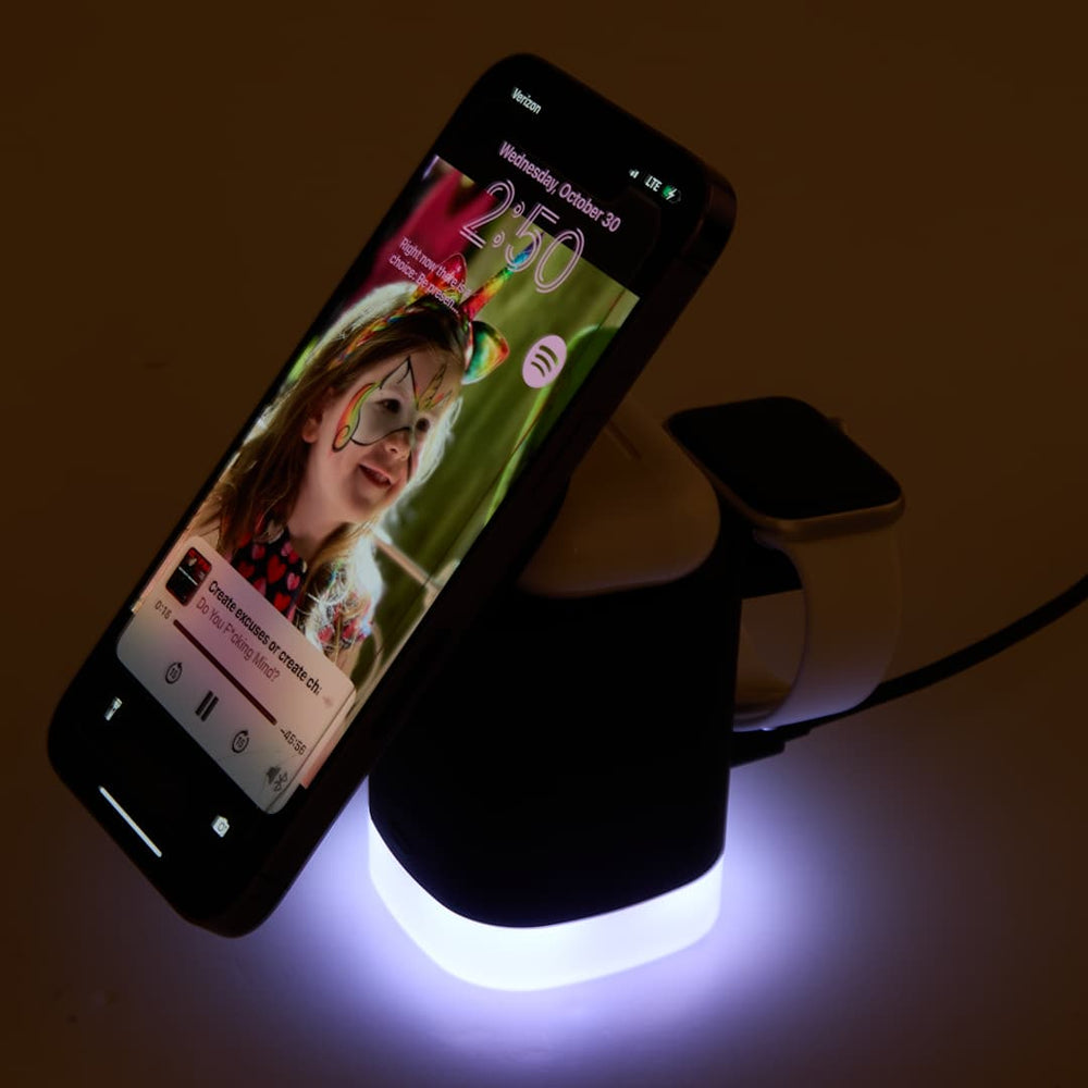 The Glow 3-in-1 15W MagClick™ Wireless Charging Stand is designed with dedicated charging spots for smartphones, Apple Watches and Airpods/Airpod Pros. The front foldable phone stand spot can hold iPhone 12 models and above magnetically for up to 15W wireless charging. The back spot supports wireless charging at up to 5W for any enabled devices, while the Apple Watch stand can be lifted up with 2.5W wireless charging for iWatches. It also features lights that make it glow! Works with most plastic phone/airpods cases on and includes 39-inch Type-C to Type-C cable. It is recommended to use UL or ETL Listed 30W USB-C power adapter for better performance. Packaged in a FSC® certified premium gift box.