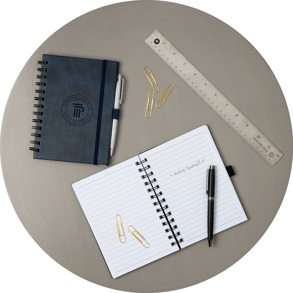 The 5” x 7” FSC® Recycled Morano Spiral Journal features a marbled cover crafted from 30% recycled polyurethane. Inside, it includes 70 sheets of lined FSC® recycled paper, offering a smooth, eco-conscious writing experience. Color-matching pen loop and elastic closure adds convenience and style. With the JournalBooks logo embossed on the back cover, this journal is both professional and environmentally friendly. Pen is not included. By choosing this notebook, you’re making a positive impact on the environment through a partnership with 1% For The Planet, as a portion of each sale supports environmental nonprofits.