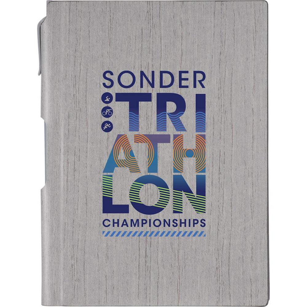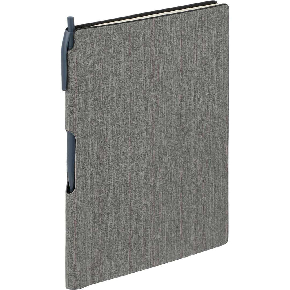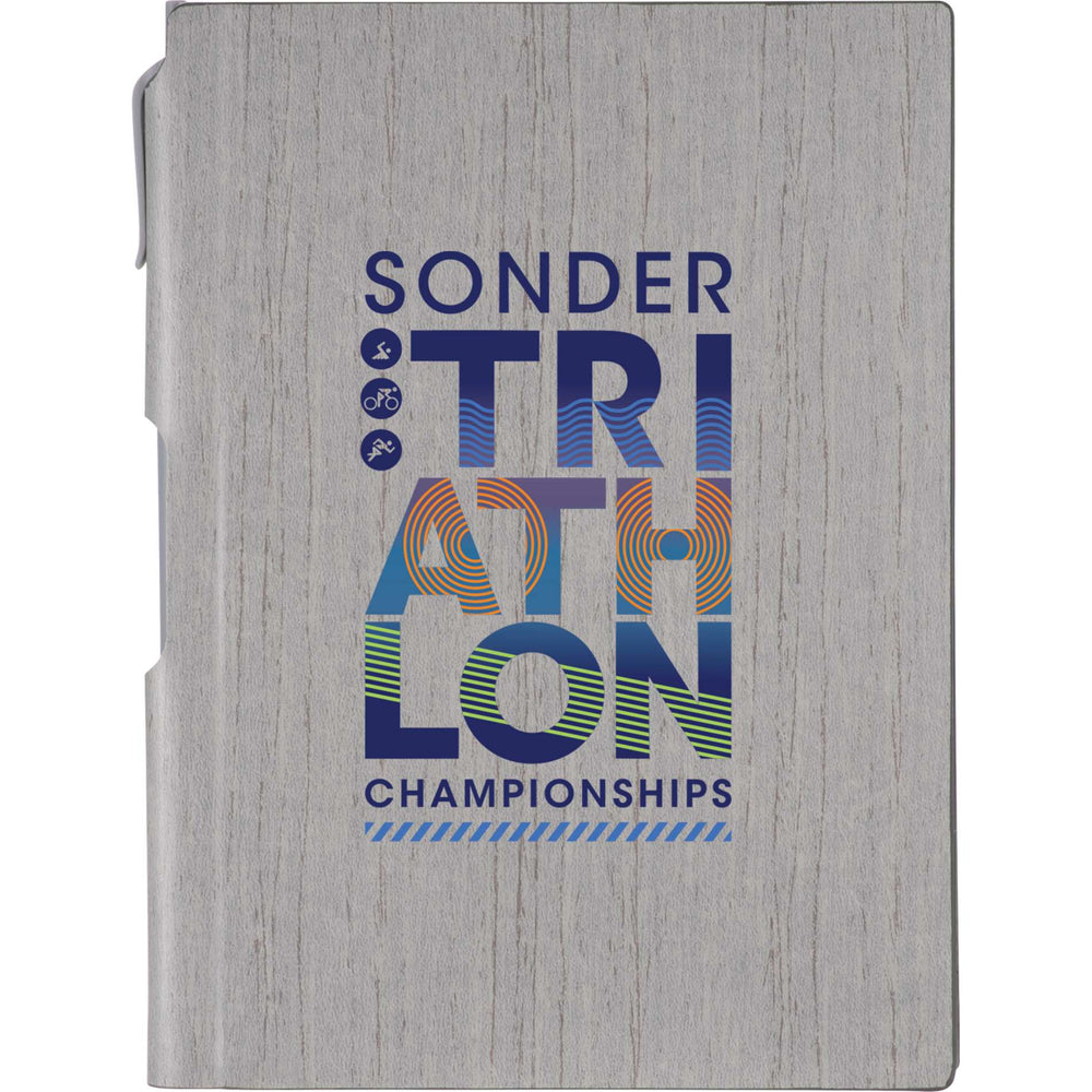 The Bullet 6" x 8.5" FSC Mix Bari Notebook with Pen is an A5 bound notebook designed to look like wood. This attractive notebook includes 80 sheets of beige ruled FSC Mix paper and a matching plastic ballpoint pen that can be tucked away in the spine.