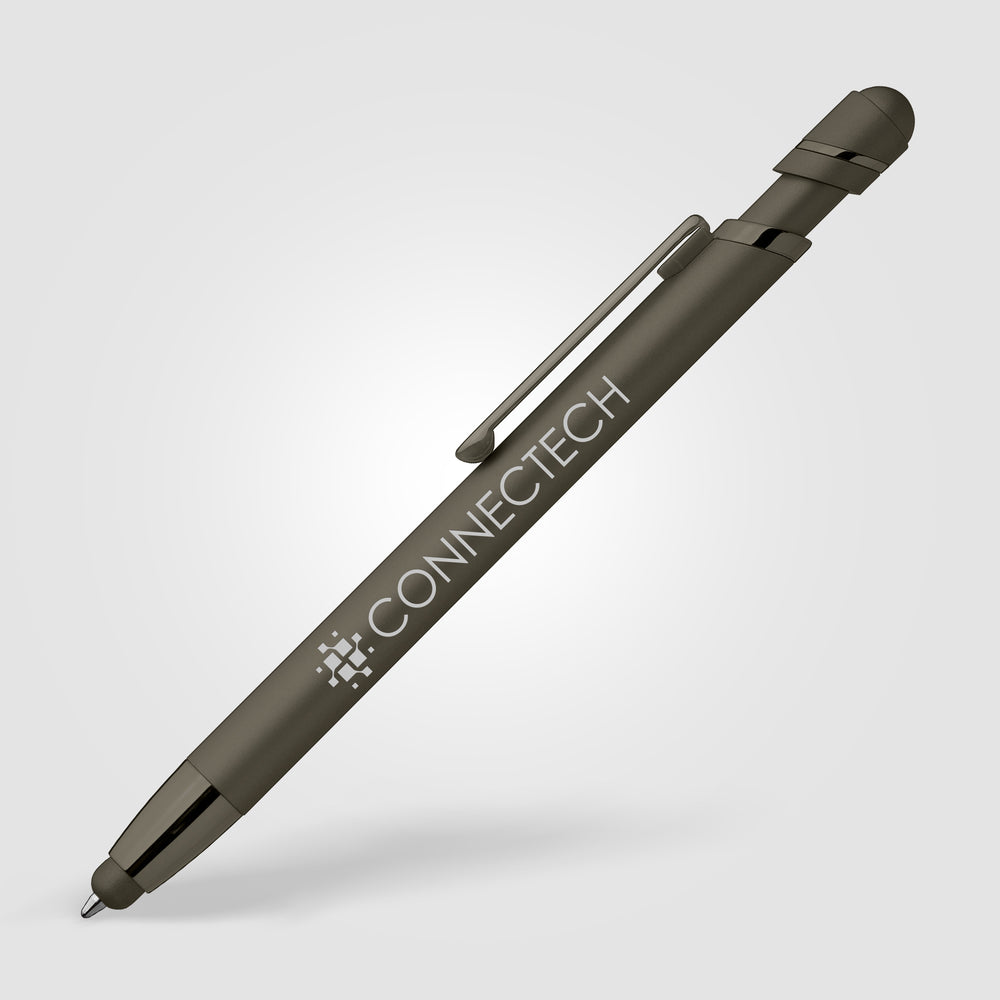 The Atlantic Softy Metallic metal pen features a contemporary monochromatic design, with luxurious soft-touch barrels complementing color-matched metallic trim for a fresh, modern look. The capacitive stylus adds useful touchscreen functionality.