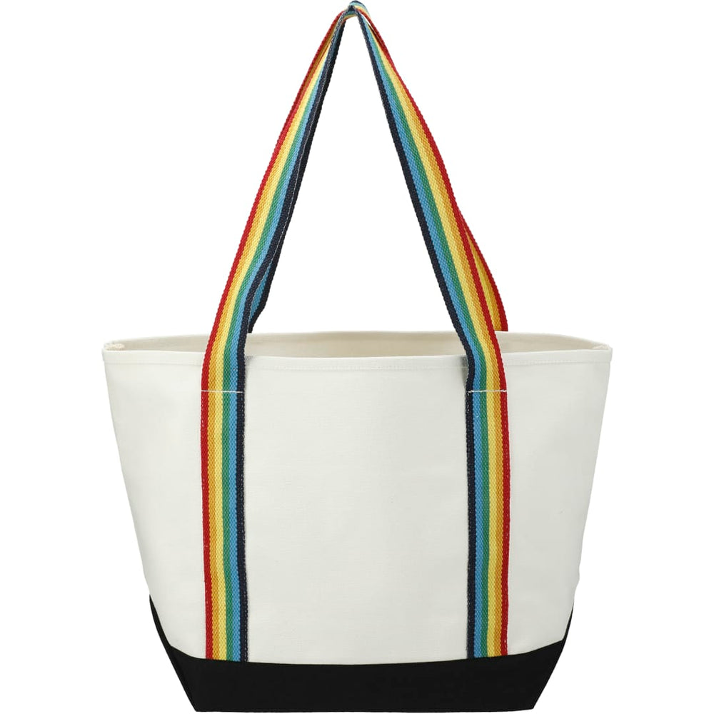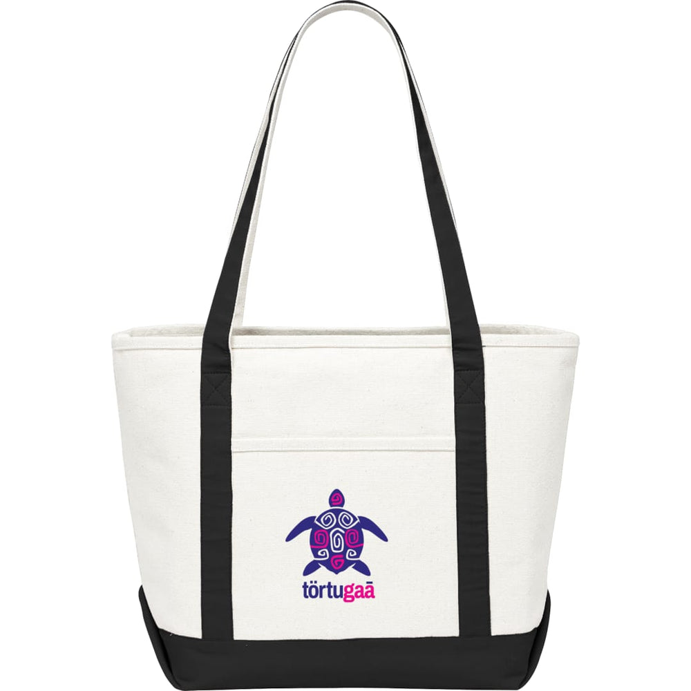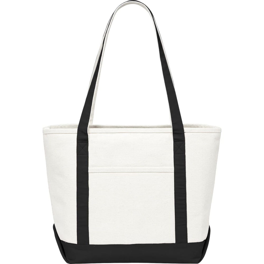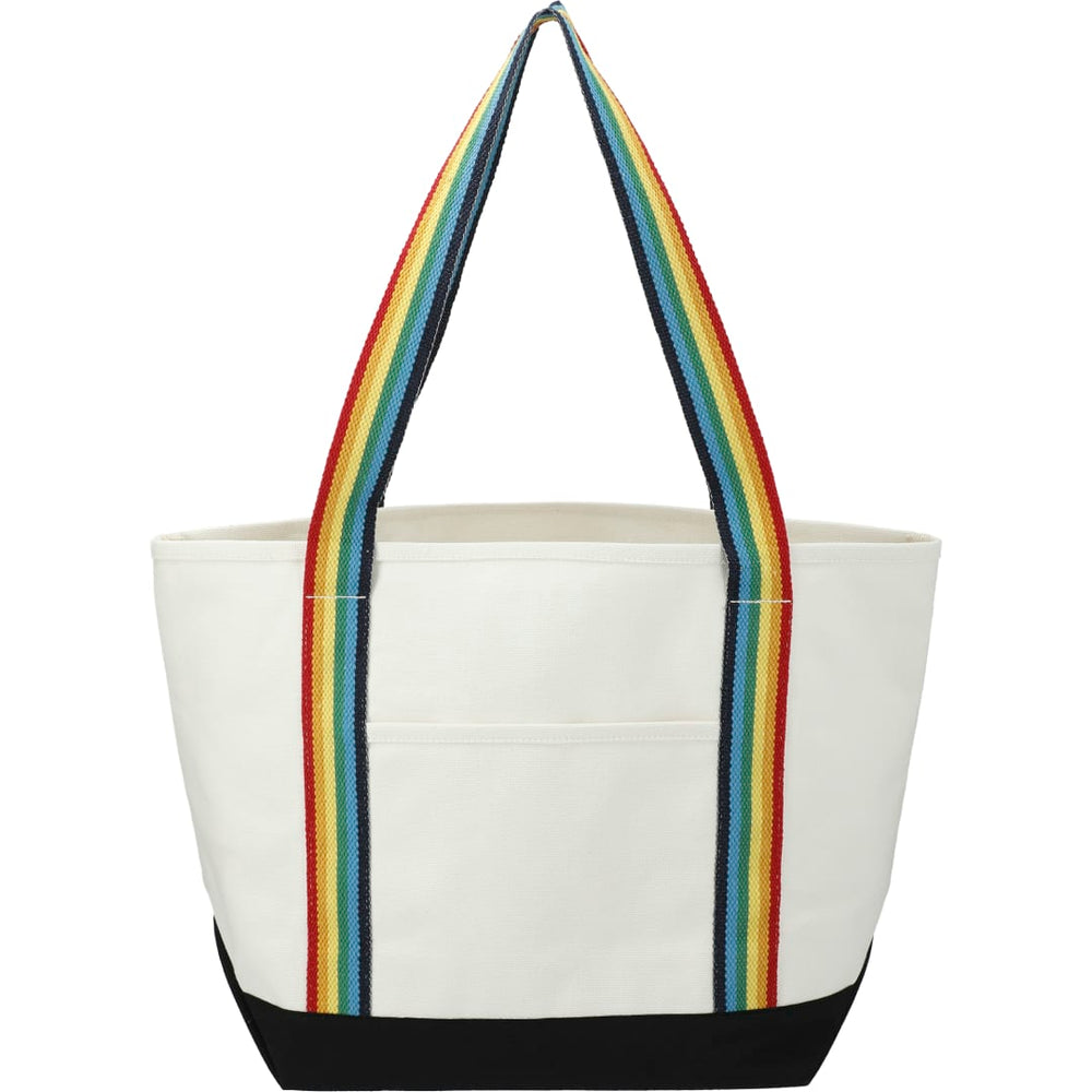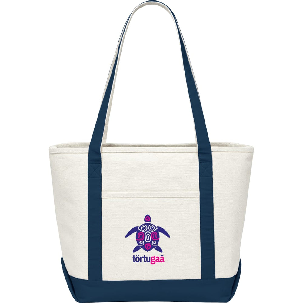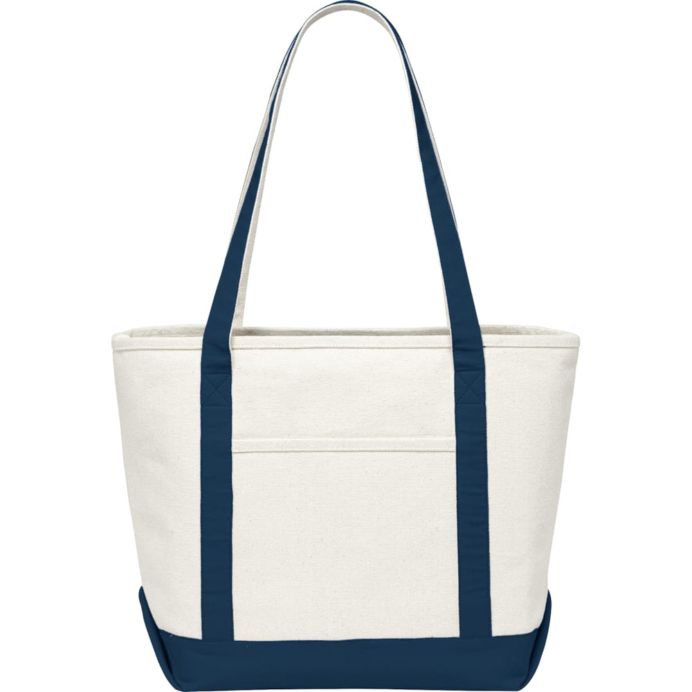 Great for outdoor events and travel. Classic boat tote shape in heavy weight and sturdy material. Open main compartment. Open front pocket. 12" handle drop height. Disclaimer: There may be minor variations in shade of the main material due to the nature of the fabric.