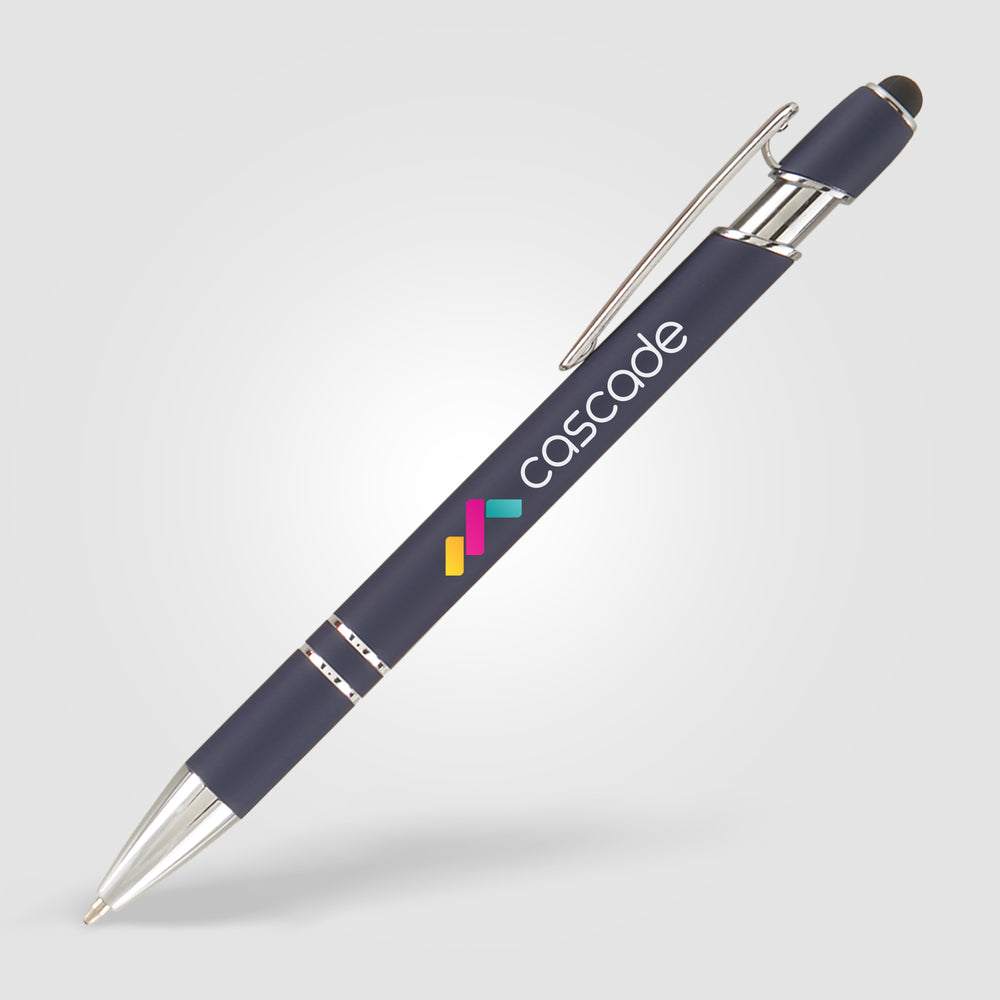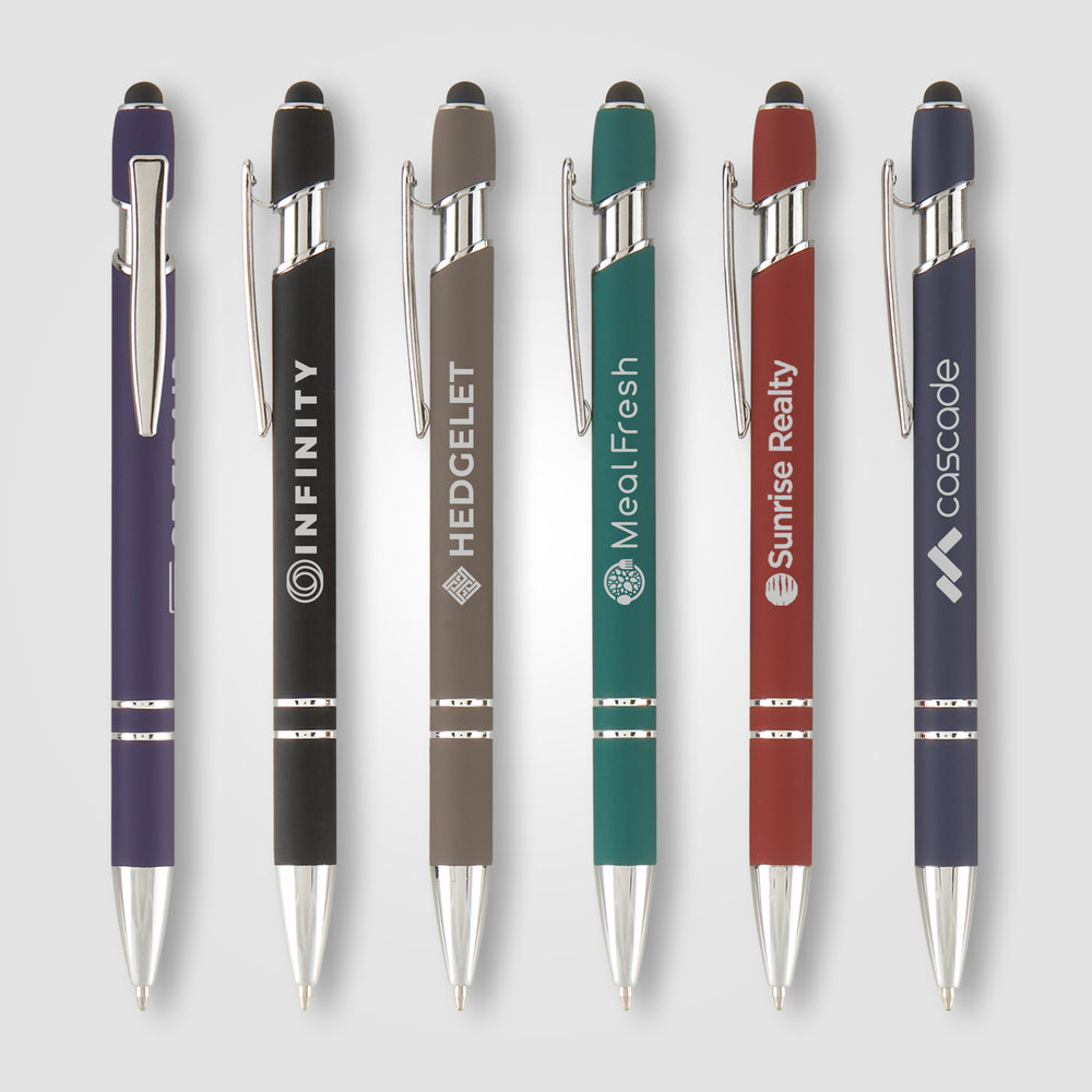 The Ellipse Softy with Stylus is a stylish, premium metal pen available in your choice of black or blue medium ballpoint ink. Choose from a variety of rubberized soft touch product colors to showcase your company name, logo or advertising information. This eye-catching promotional pen will be a favorite at conventions, trade shows, corporate functions and more!