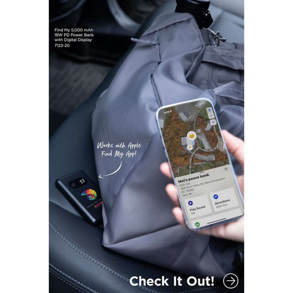 Find My 5000 mAh 18W PD Power Bank with Digital Display features a rechargeable lithium polymer battery (18.5Wh) for charging smartphones and other devices at 18W charging speed. It also features with digital display to show power capacity. Type-C Input/Output Port: 5V/2A, 9V/2A, 12V/1.5A (18W max); USB-A Output: 5V/2.1A, 9V/2A, 12V/1.5A (18W max). Compatible with Apple devices utilizing the Find My App, it ensures you are always in control with this MFi certified Find My Power Bank. With step-by-step directions provided through the Find My App, locating your items is effortless. Includes a 19-inch Type-C-to-Type-C charging cable. Packaged in an FSC®-certified premium gift box. Power banks are permitted in carry-on luggage only, and at the discretion of TSA agents. Please charge power bank before initial use.