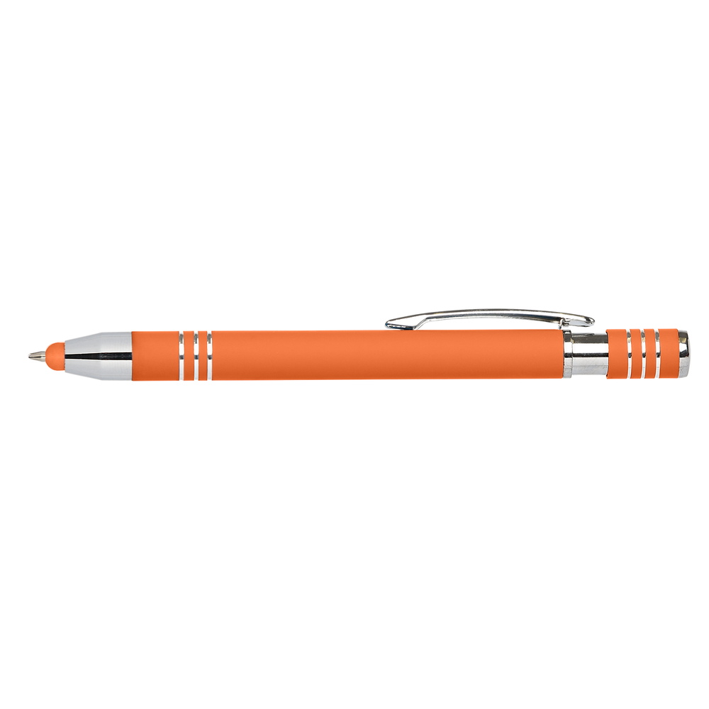 An upscale-looking metal pen with a comfortable, rubberized soft touch finish. Featuring a medium ballpoint and a touchscreen capacitive stylus, the Marin Softy pen makes a great premium business gift. Select from a variety of vibrant barrel colors, all adorned with chrome accent rings, and customize it with your logo.